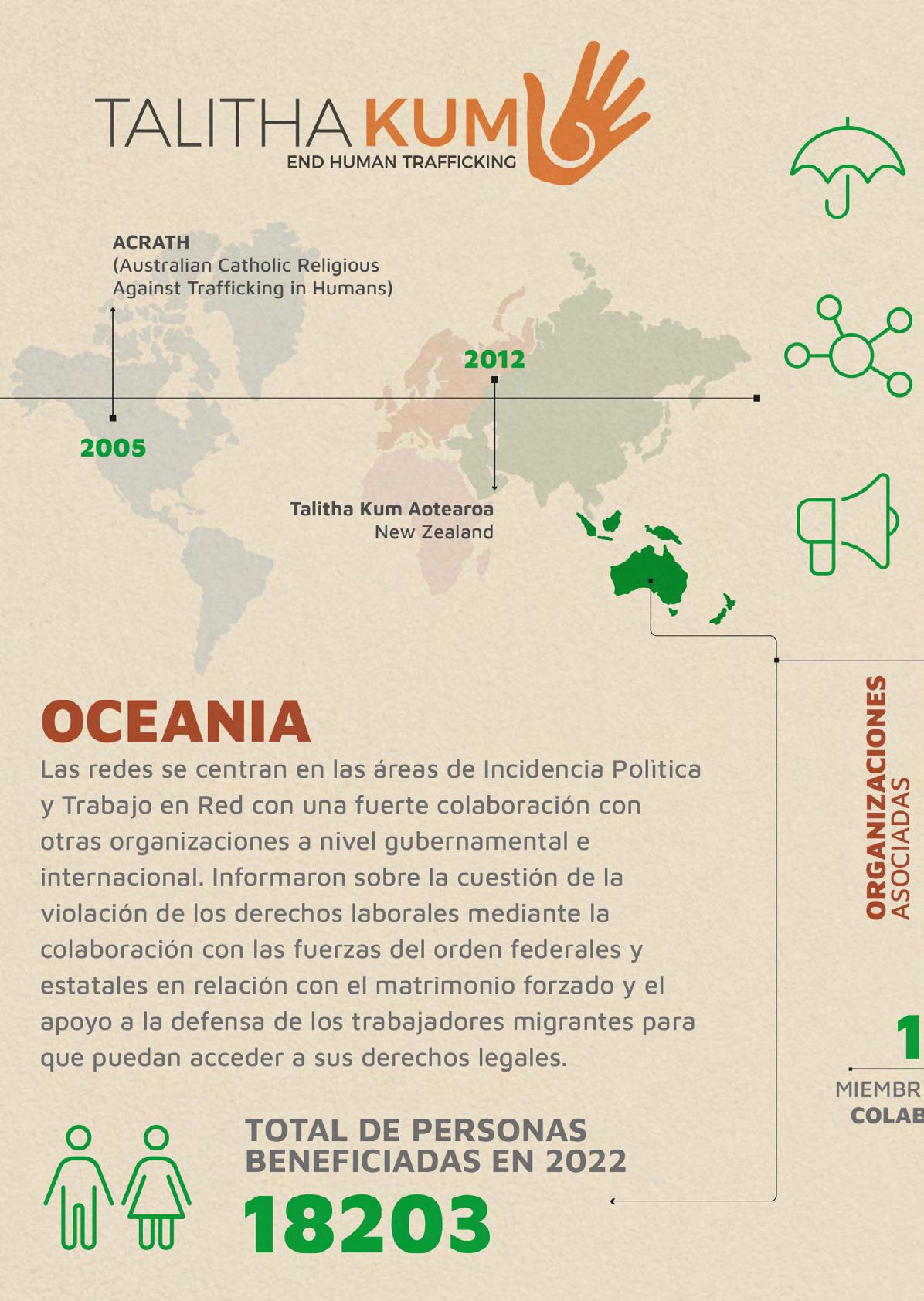 Otro aspecto destacado de la sólida colaboración de Talitha Kum con otras religiones o grupos interconfesionales viene marcado por el crecimiento de nuestra red, que experimentó un aumento del 31% en 2022, a escala local, regional e internacional, especialmente en Asia, África y Oceanía. La implicación de Talitha Kum en la sensibilización y el empoderamiento de las supervivientes es significativamente visible en los continentes americano y africano. Además, no se puede subestimar la labor de defensa a nivel nacional. En particular, destaca el trabajo realizado por las redes en Europa, América y Oceanía.