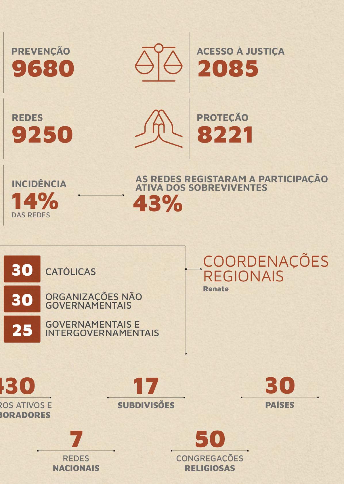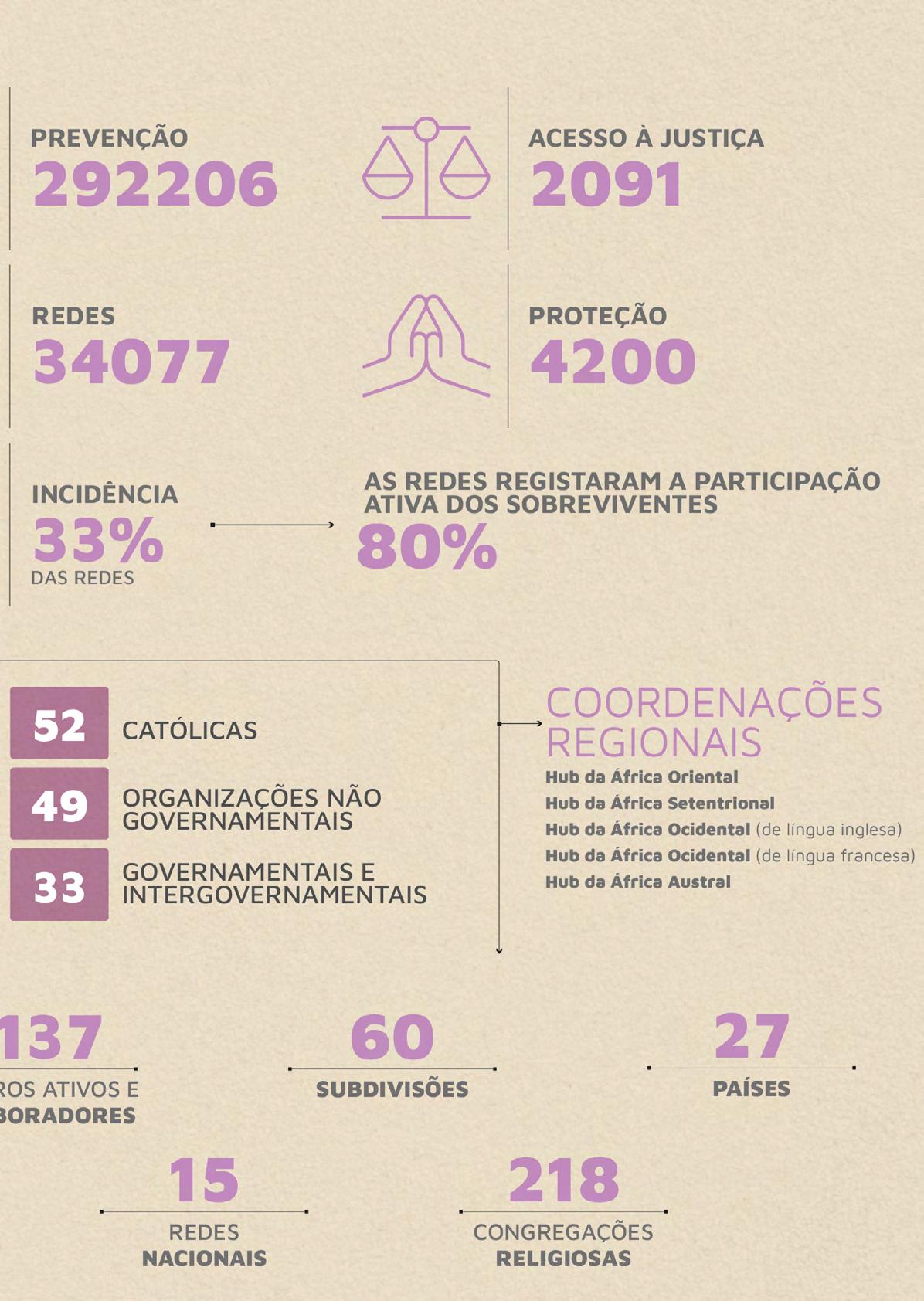 As páginas seguintes contam algumas histórias - percursos de libertação - de cuidar, curar, empoderar e recuperar mulheres, jovens, crianças e grupos de risco. São histórias de esperança e gratidão pelo trabalho de religiosas, sacerdotes, religiosos e parceiros leigos, presentes em 5 continentes, em 58 redes intercongregacionais, em 97 países.