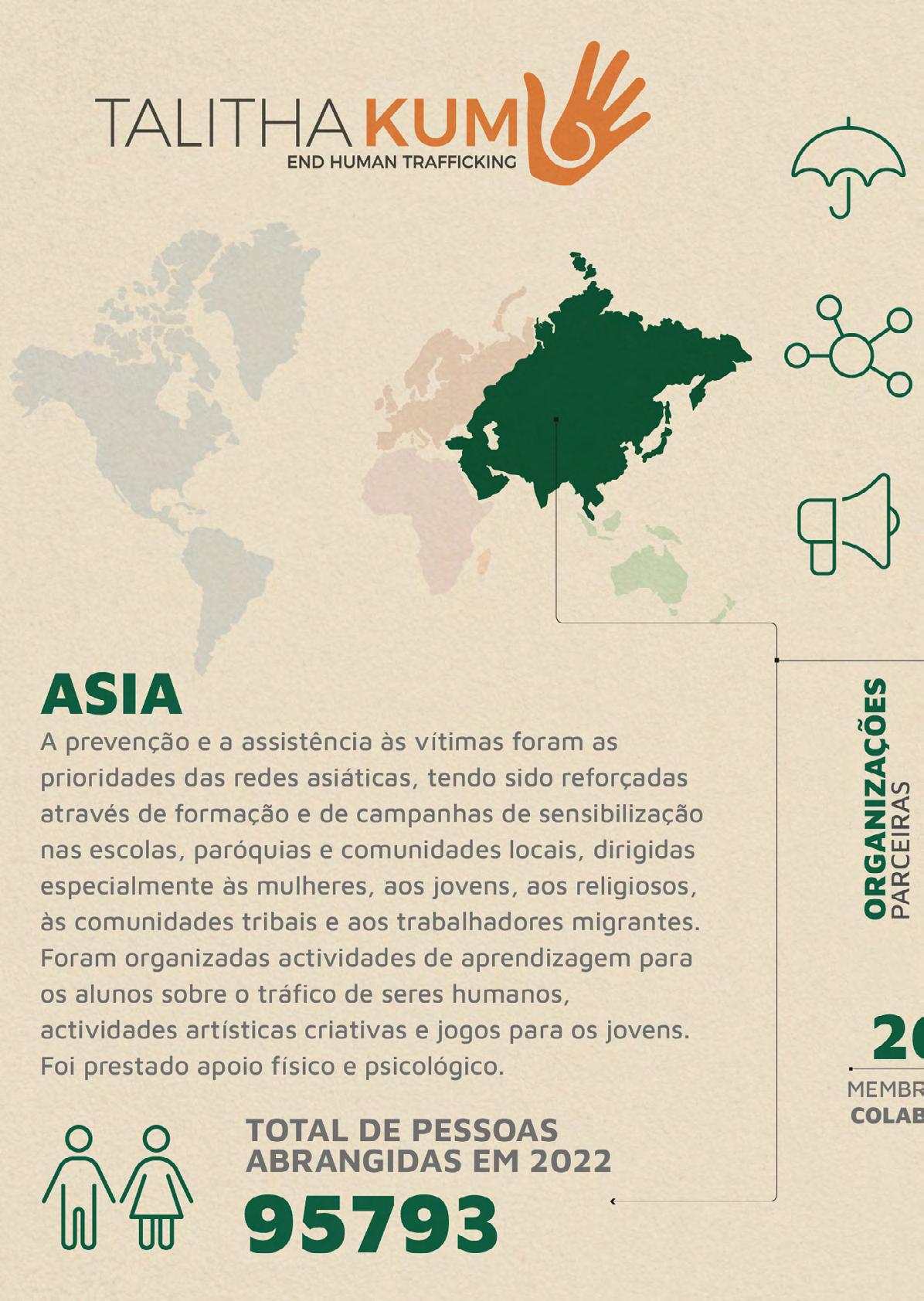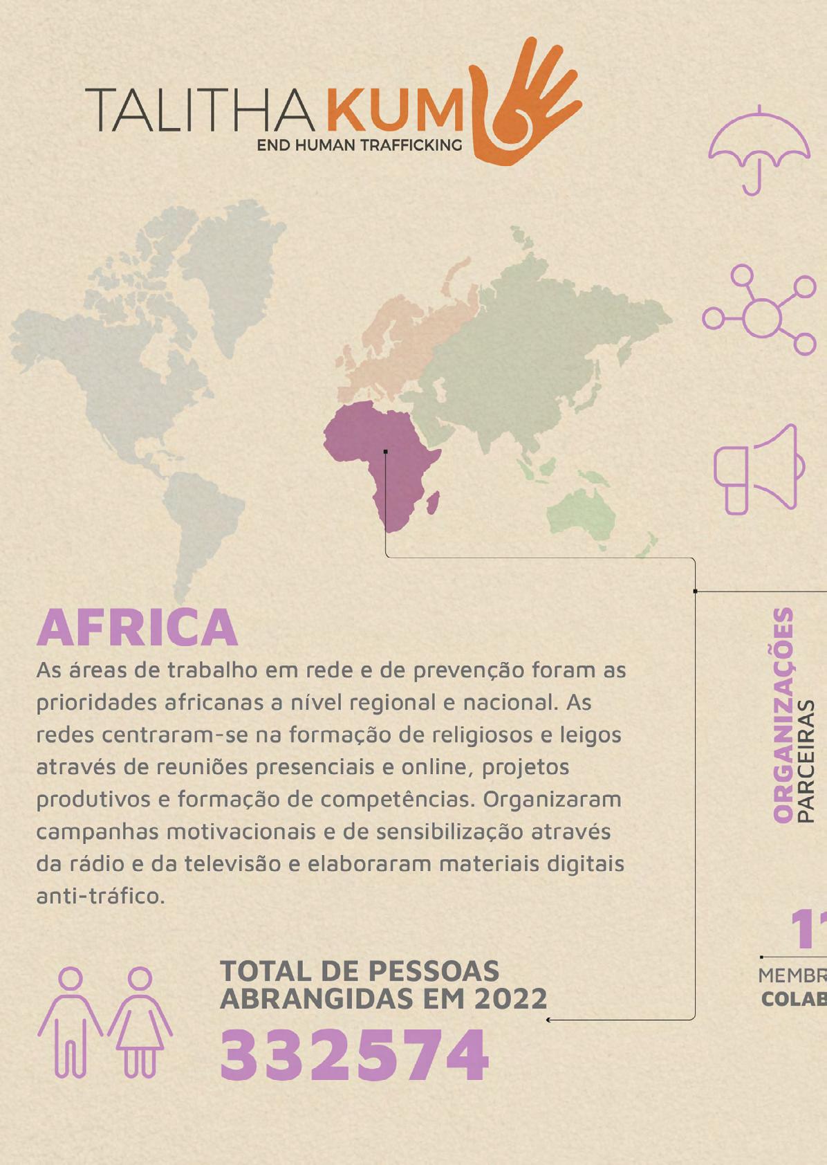 Outro aspecto saliente da forte colaboração de Talitha Kum com outras religiões ou grupos inter-religiosos é marcado por seu crescimento de 31% em 2022, nos níveis local, regional e internacional, principalmente na Ásia, África e Oceania. O envolvimento de Talitha Kum na conscientização e empoderamento dos sobreviventes é significativamente visível nos continentes americano e africano. Além disso, não podemos subestimar o trabalho de incidência a nível nacional. Em particular, destaca-se o trabalho realizado pelas redes Europeia, Americana e da Oceania. Internacionalmente, continuamos a colaborar com organizações e agências internacionais, em particular com a OIM, o ACNUR, a OSCE, o Fórum Inter-religioso do G20, a Seção Multilateral da Secretaria de Estado, os Embaixadores junto à Santa Sé e muitas outras organizações parceiras, para apoiar e desenvolver a coordenação recíproca no enfrentamento deste gravíssimo problema, mobilizando a sociedade não só para condenar o tráfico de seres humanos, mas também para denunciar as suas causas.