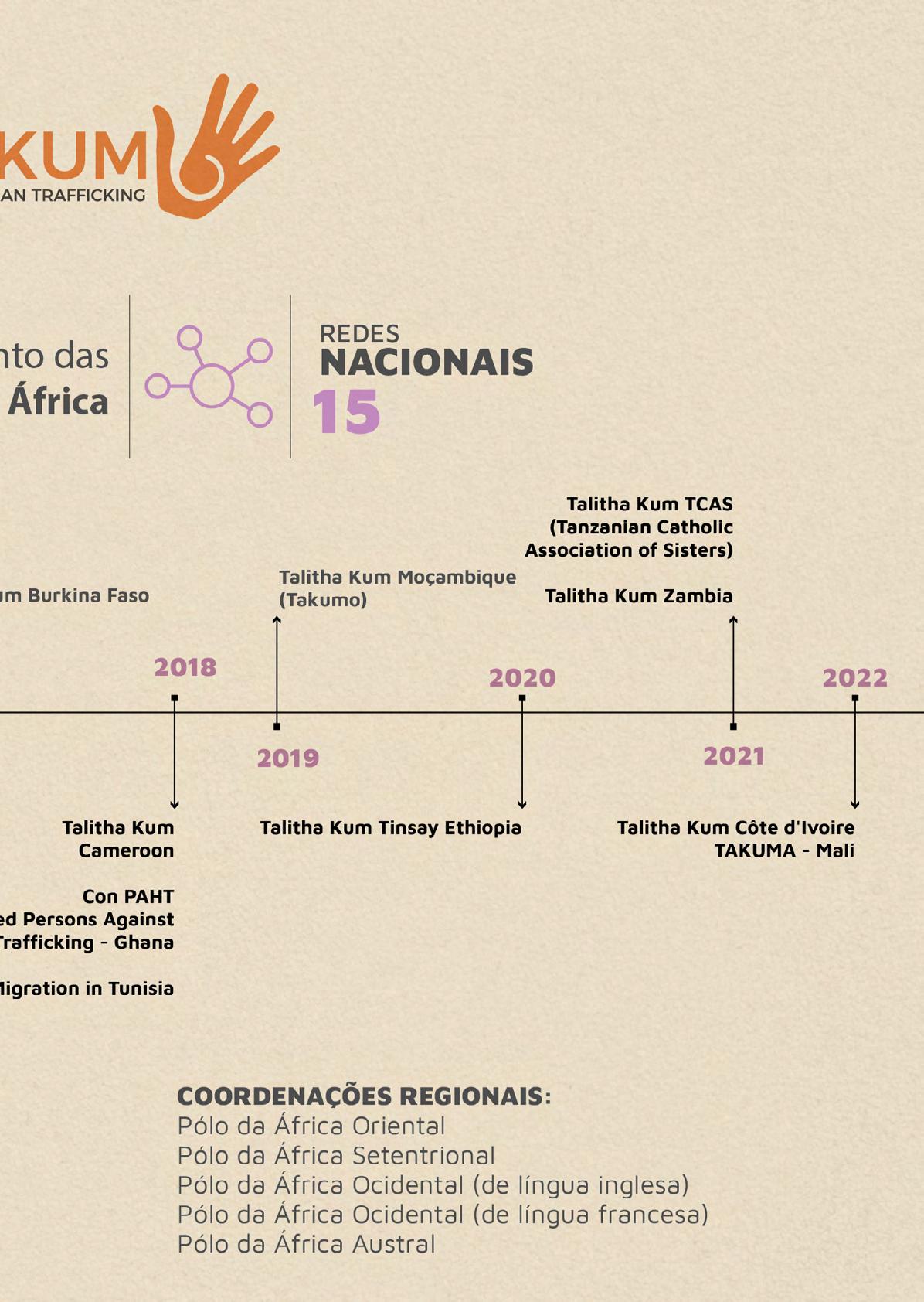 Através do Oceano Pacífico para chegar a Cochabamba, na Bolívia: Graças à contribuição da Comissão contra o tráfico de pessoas na América Latina, as redes Talitha Kum reuniram-se de 16 a 18 de setembro de 2022, durante o encontro da CLAR (Confederação Latino-Americana de Religiosos). Um mês depois, de 26 a 28 de outubro de 2022, a rede da U.S. Catholic Sisters Against Human Trafficking, das religiosas católicas estadunidenses comprometidas no combate ao tráfico de pessoas, reuniu-se por ocasião de sua conferência anual, centrada no tema “Tecer comunidades, construir capacidades, influenciar a mudança”. Na Europa, a terceira assembleia da RENATE foi realizada de 13 a 19 de novembro de 2022, em Fátima, Portugal. O tema do encontro foi “Realizar o sonho: Um mundo livre da escravidão”.