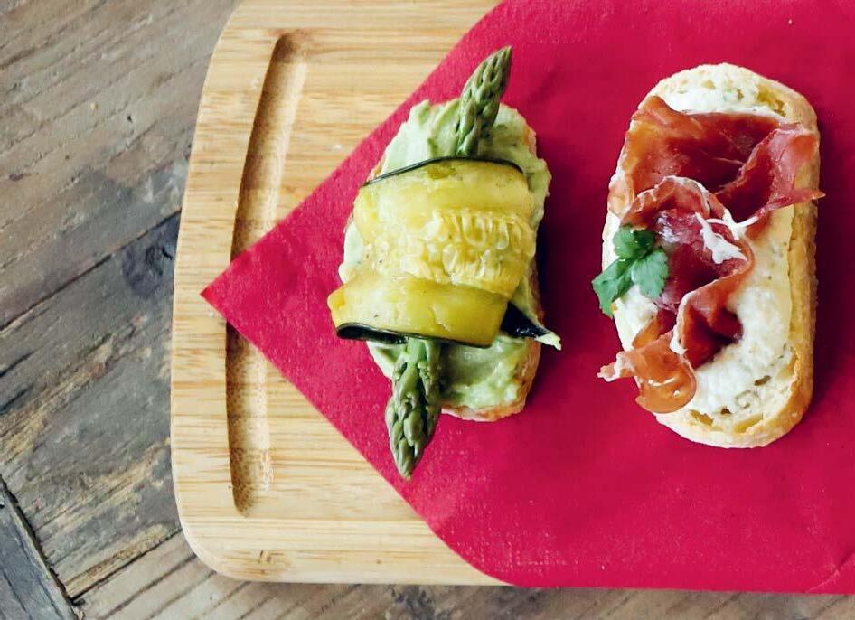 Spread the asparagus cream on a baguette slice measuring 1 1/2 cm thick, place a grilled courgette slice on top and garnish with a piece of sundried tomato.