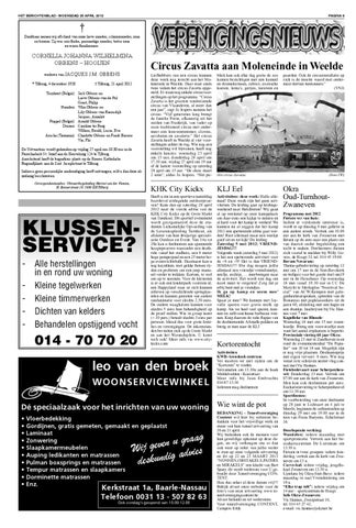 Okra Oud-TurnhoutZwaneven Programma mei 2012 Fietsen ver van huis: Indien er voldoende interesse is, wordt er op dinsdag 8 mei gefietst in een andere streek. Vertrek om 10.00 uur aan de kerk van Zwaneven met fietsen op de auto naar een plaats om van daaruit onder begeleiding een tocht te maken. Deelnemers dienen zich vooraf te melden bij Willy Govers, de Hoogt 33, tel. 014 45 19 68. Rerum Novarum: Thema-gebedsviering op zaterdag 12 mei om 17 uur in de Sint-Bavokerk en trefquiz voor het goede doel om19 uur in de Heischuur. Op woensdag 16 mei vanaf 19.30 uur in CC De Marc/kt te Merksplas “Feestival Social” van ACW-Kempen met gelegenheidstoespraken, optreden van de Bonanzas met popklassiekers uit de jaren 60, afsluiting met een hapje en een drankje. Inschrijven bij Vic Hannes voor 7 mei. Kapelleke van Rhoode: Woensdag 16 mei om 15 uur rozenhoedje. Breng een vouwstoeltje mee want het aantal zitplaatsen is beperkt. Provinciale viering 60 jaar Okra: Woensdag 23 mei te Zandhoven in en rond de evenementenhal “De Populier” van 10 tot 18 uur. Mogelijk zijn er nog vrije plaatsen. Deelnameprijs met eigen vervoer: 8 euro. Wie nog wenst in te schrijven neemt vlug contact met Vic Hannes. Fietsbedevaart naar Scherpenheuvel: Donderdag 23 mei. Vertrek om 07.00 uur aan de kerk van Zwaneven. Men kan ook deelnemen per auto. Eucharistieviering te Scherpenheuvel om 11.30 uur. Sportfeesten: In voorbereiding van onze deelname op 28 juni te Lichtaart en 4 juli te Meerle, beginnen de oefenstonden op dinsdag 29 mei om 19.00 uur in de tuin van Frans Baeyens, Echelstraat 16. Doorlopende werking: Wandelen: iedere maandag met sportpromotie. Vertrek aan het bezoekerscentrum De Liereman om 13.30 u. Fietsen in twee groepen: iedere donderdag, vertrek aan de kerk van Zwaneven om 13 u. Curve-bal: iedere vrijdag, jeugdlokaal Zwaneven om 13.30 u. Lijndans bij Okra-Sint-Bavo: iedere maandag in zaal Vriendenkring om 19 u. “Elke trap telt”: iedere vrijdag om 14 uur – sportcentrum de Hoogt. Info Okra-Zwaneven: Vic Hannes, Zweepstraat 10, tel. 014 45 27 42, e-mail: vic.hannes@skynet.be