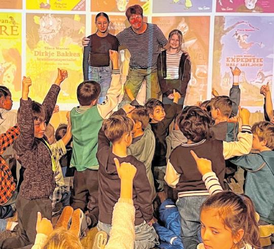 Twee leerlingen, Anne Overweg en Nicky Molengraaf, hebben dit schrijversbezoek samen met klasgenoten georganiseerd. Anne: “Samen met de mediacoach hebben we een plannetje gemaakt. We wilden natuurlijk een schrijver uitnodigen die veel kinderen leuk vinden. Daarom hebben we als voorbereiding in de klas naar ‘de Waanzinnige Podcast’ geluisterd. In deze podcast vertellen kinderen over hun favoriete boeken.”