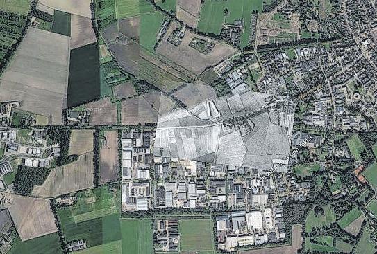 Een luchtfoto van Kamp Bladel (zichtbaar als een omgekeerde V in het grijze vlak)