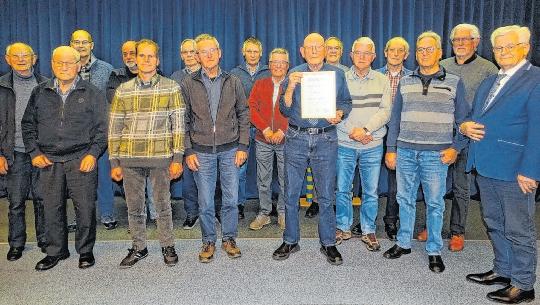 Het Alphens Mannenkoor, foto bij het jubileum van koorlid Wil Manniën.