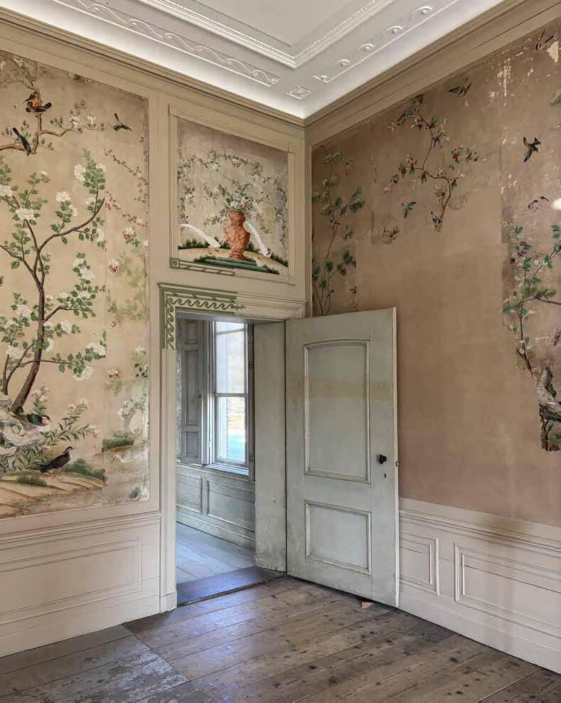 Speciale aandacht gaat uit naar het achttiende-eeuwse Chinees behang in landhuis Oud-Amelisweerd in Bunnik (afb. 5). Dit landhuis is de enige plek in Nederland waar maar liefst twee aangrenzende kamers zijn gevuld met Chinees behang, waaronder een kamer met vogel-en-bloembehang en landschapsbehang (afb. 6). Daarnaast worden in