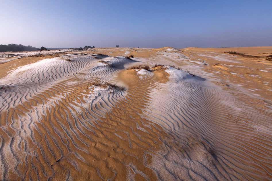 During the Weichsel ice age (115,000 to ca 11,700 years ago), the temperature plummeted once more. It became so cold that polar storms occurred, carrying in large amounts of sand from the west, especially from the North Sea, which was largely dry at the time. The wind deposited a metre-thick cover of sand on the bare landscape (called ‘dekzand’ or ‘cover-sand’ in Dutch). Wind-borne sand deposits are not found on higher parts of the moraines; as the wind was too strong there, the sand never settled. Sometimes sand ridges and dunes formed; examples in the Park include the sand ridge between the Otterlose Bos and De Pampel, and the barchan (crescent-shaped ridge) of De Kemperberg.