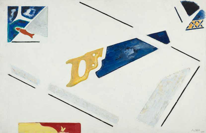 De relaties op scherp: de bespreking van Alma’s werk in De Stijl In juni 1918 wijdde Van Doesburg in De Stijl een bespreking aan Alma’s schilderij Zaag met goudvissenkom [afb. 10]. Wat bracht hem ertoe dit allerminst abstracte kunstwerk op te nemen in zijn tijdschrift? Om dit te begrijpen is het belangrijk stil te staan bij de opmerkelijke metamorfose die Alma’s werk had ondergaan tussen de ontmoeting met Van Doesburg in februari 1916 en de publicatie van het artikel in juli 1918. Alma’s vlotte, expressieve schildertrant had langzaamaan plaatsgemaakt voor sobere stillevens met witte achtergronden waarop een paar min of meer realistisch weergegeven objecten in hoofdzakelijk primaire kleuren zijn gerangschikt [afb. 8, 9, 10, 13, 14]. Hier en daar is een minimale indicatie van ruimte, zoals een slagschaduw bij een voorwerp, maar de werken ogen overwegend plat. Wel is de verfstreek opmerkelijk levendig en het verfoppervlak opgebouwd uit subtiele kleurnuances, een sterk contrast met de strakke zwarte lijnen die de composities overheersen. Alma raakte in deze tijd zichtbaar onder de indruk van het werk van Bart van der Leck, die in 1916 in Laren was komen wonen en met wie Alma enkele jaren een vriendschappelijk contact had. Hoewel Alma op een onbekend moment in 1916 naar Amsterdam verhuisde, zal hij Van der Leck mogelijk nog in Laren via Mondriaan hebben leren kennen, want tussen Van der Leck en Mondriaan was een geanimeerde uitwisseling van artistieke ideeën ontstaan die voor wederzijdse beïnvloeding zorgde. In de loop van de jaren tien was Van der Leck steeds abstracter gaan werken. Schilderde hij aanvankelijk nog sociaal bewogen voorstellingen, bevolkt door algemene types in een vereenvoudigde, figuratieve