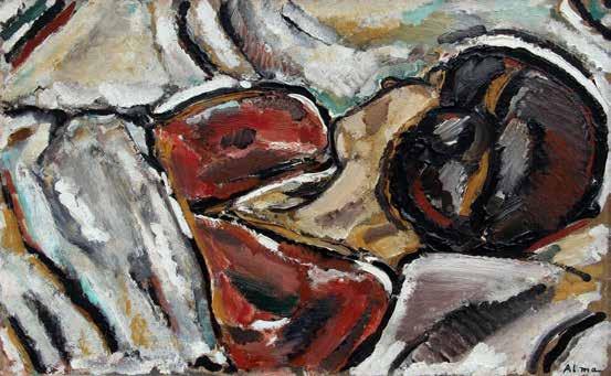 Winter, de toepassing van horizontale en verticale lijnen in de schilderkunst, ‘beeldende wiskunde’, muziek en de kunsttheoretische artikelen die Van Doesburg had gepubliceerd. In zijn brief gaat Van Doesburg op elke gesprekspartner in, maar over Alma vertelt hij niet meer dan “een schilder der ‘Moderne Kunstkring’”.14 Wellicht deed Alma niet actief mee aan de verhandelingen, of Van Doesburg vond zijn inbreng niet vermeldenswaardig. Ze hadden ook niet veel gemeen. Alma was geen theoreticus en de stillevens en portretten in stevige, expressieve verfstreken met dikke zwarte contouren die hij op dat moment schilderde, hadden weinig raakvlakken met de richting van vergeestelijking en abstractie waar Van Doesburg zijn pijlen op had gericht [afb. 6, 7].