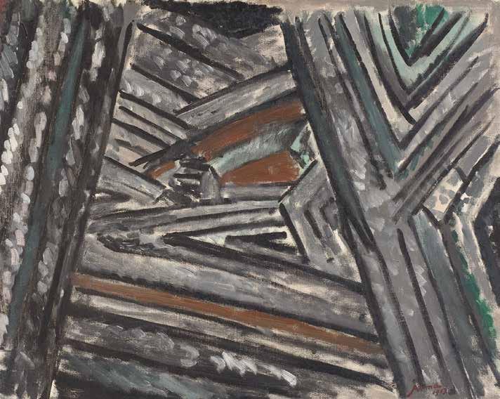 met Mondriaan, die net naar het centrum van de Europese kunst was verhuisd en een atelier betrok op hetzelfde adres als twee andere Nederlandse kunstenaars met wie Alma goed contact had: Lodewijk Schelfhout en Conrad Kickert [afb. 1] 3 Toen Schelfhout het jaar erop terug verhuisde naar Nederland, nam Alma zijn atelier over.4 Alma was toen nog een zoekende kunstenaar, volledig gericht op de kunst om de kunst, zonder enige blijk van maatschappelijk engagement. Hij absorbeerde de moderne stromingen die hij om zich heen zag, zoals neo-impressionisme en kubisme, en experimenteerde erop los. Het kubisme was op dat moment het nieuwste wat de kunst te bieden had en beïnvloedde niet alleen Alma. De nieuwe beeldtaal van kubisten als Pablo Picasso en Georges Braque was voor Mondriaan de reden geweest zich in Parijs te vestigen, om dichter bij het vuur te zitten.5 Alma schilderde in 1912 en 1913 een aantal landschappen die een zekere invloed van het kubisme vertonen in de opdeling van de voorstelling in vlakken en lijnen. Zo overheerst in Paysage het spel van donkere diagonalen [afb. 2] en paste Alma in twee bijna identieke werken – Gentilly en Centilla – een geometrische vlakverdeling toe,