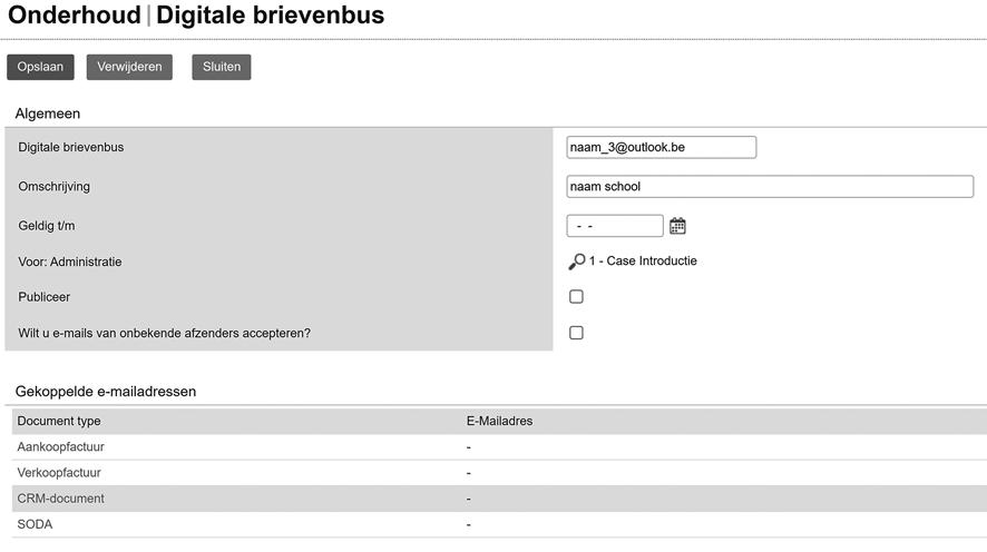 Door aan de digitale brievenbus een administratie te koppelen, vraagt het programma nu om ook een mailadres te koppelen aan de digitale brievenbus voor inkomende aankoopfacturen, uitgaande verkoopfacturen, CRM-documenten en SODA.