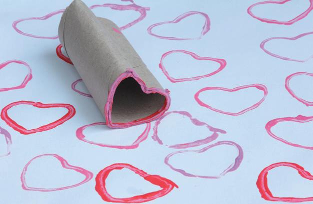 Plooi de wc-rollen in de vorm van een hart, een vierkant, een rechthoek en een driehoek. Dat is niet moeilijk: plooi de cirkelvormige wc-rol tot de vorm die je wilt en wrijf stevig op de gemaakte plooien zodat de nieuwe vorm blijft staan. Zo maak je de stempels waarmee de kleuters straks kunnen stempelen.