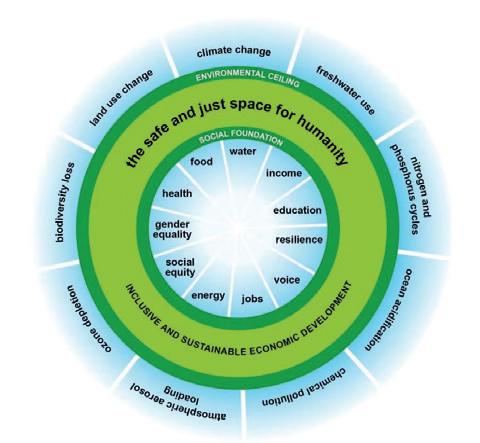 Uitgaand van de kracht van beelden ontwierp de Britse econome Kate Raworth het donutmodel. Volgens Raworth is het hart van de economie een donut. Met Doughnut Economics schuift de econome een omkering van het economische denken naar voren; een omkering waarbij de natuur niet langer de blinde vlek van het systeem is, maar er – samen met de mens – het hart van vormt, zie figuur 4.