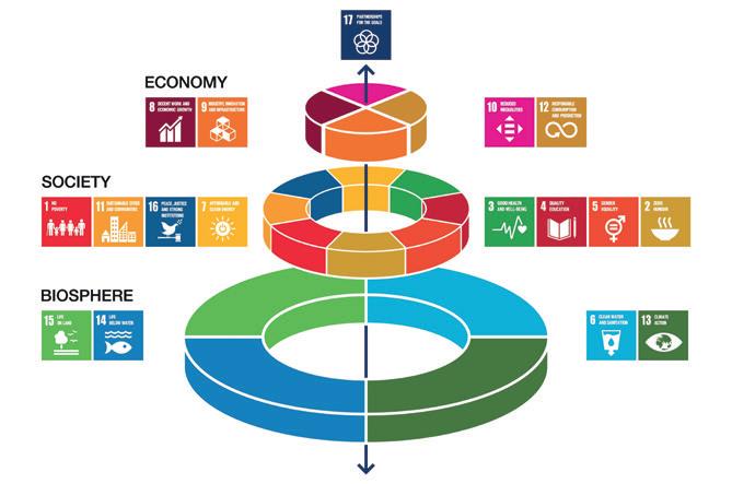 Zo kunnen de SDG’s perfect gekoppeld worden aan het bullseye-model, zie figuur 7. In dat ecocentrisch denkkader staat het ecosysteem centraal en vormen sociale rechtvaardigheid en economische activiteit daar een afgeleide van. De SDG’s maken zichtbaar hoe die abstracte structuur kan worden ingevuld en bewaakt in de praktijk. Zo bieden doelen als SDG 13 (klimaatactie), SDG 15 (leven op het land) of SDG 6 (schoon water en sanitair) houvast om planetaire grenzen te bewaken. Andere doelen, zoals SDG 1 (geen armoede), SDG 3 (goede gezondheid en welzijn) en SDG 7 (betaalbare en duurzame energie), verwijzen dan weer naar de sociale ondergrenzen die ook in het donutmodel worden benoemd.