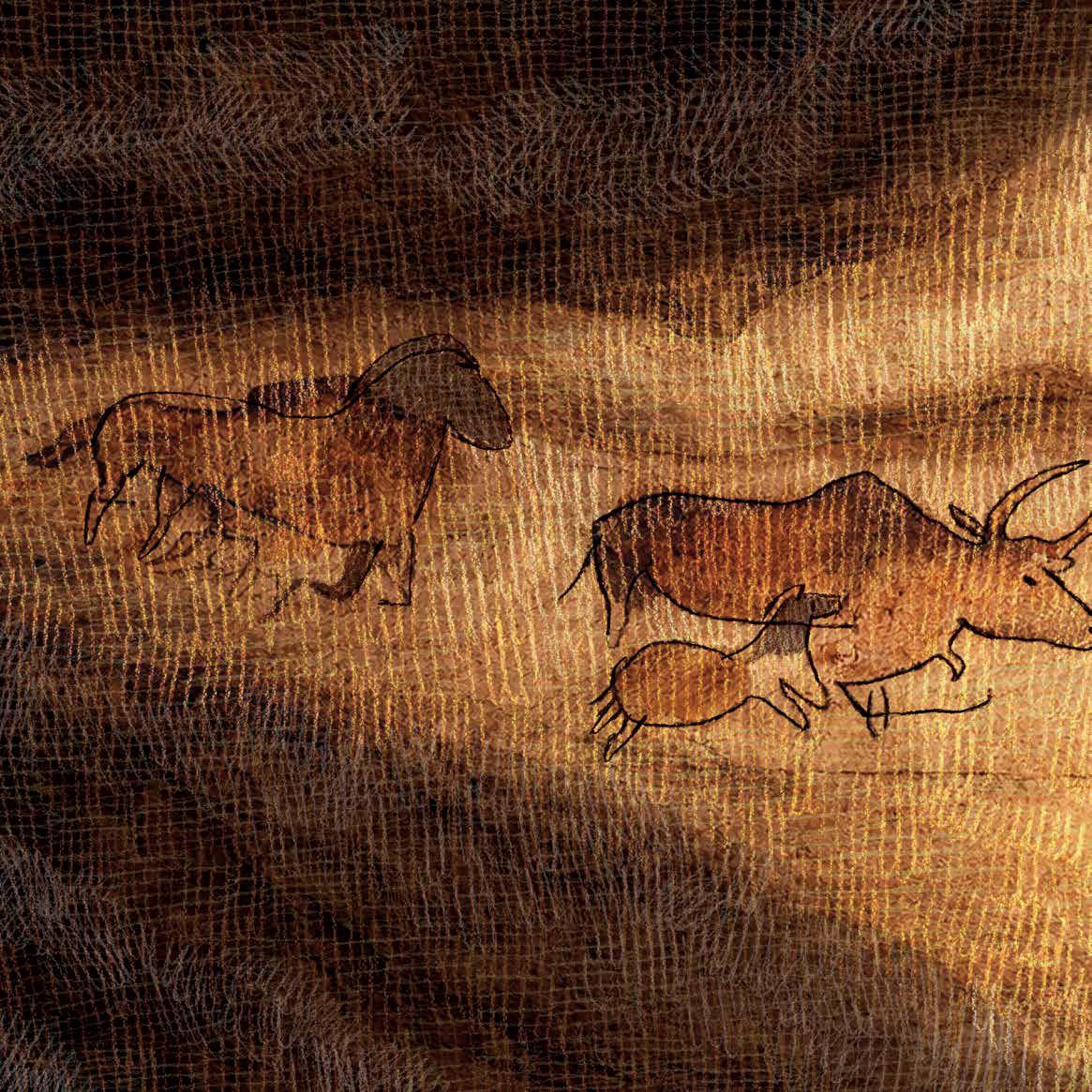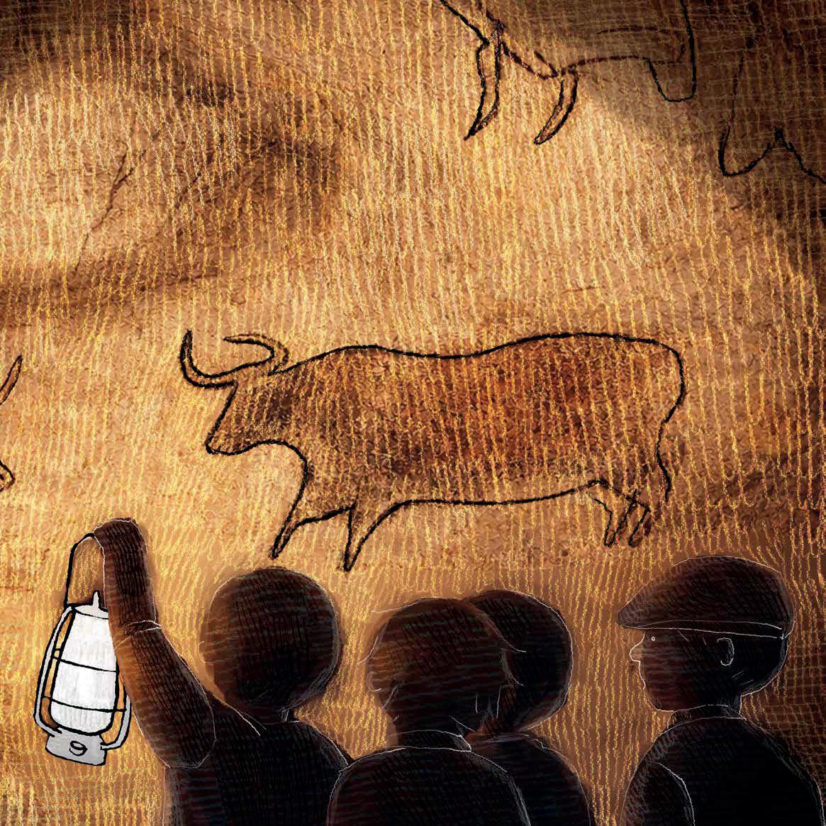 Dit is een spread uit het prentenboek van thema 4 over de grotten van Lascaux.
