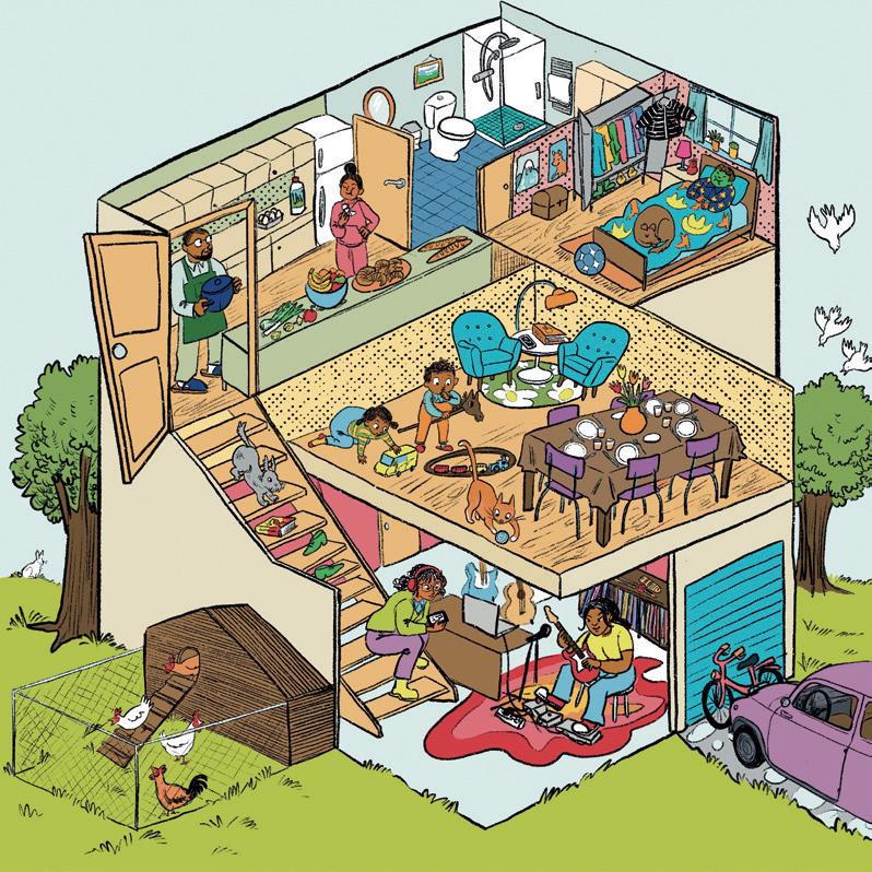 64 1 la salle de bains / 2 le bureau / 3 le garage / 4 le jardin
