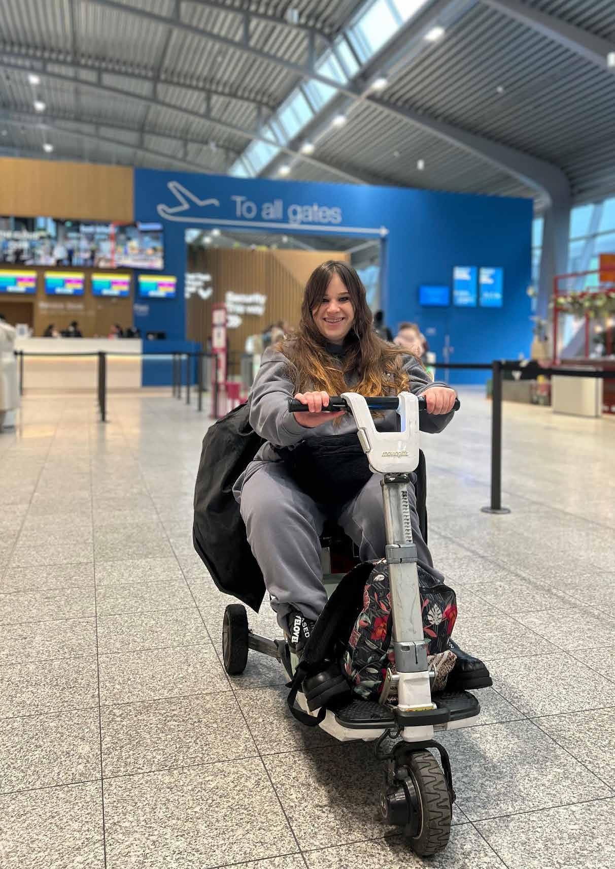 ‘Vandaag ga ik op reis naar Oslo, om daar een concert te bezoeken. Ik ben vanochtend om 8.15 uur vertrokken vanuit Rotterdam. Iemand heeft me gebracht naar het treinstation, ik heb de trein gepakt naar Eindhoven en op het CS de bus gepakt richting het vliegveld. Zowel voor de trein als de bus heb ik hulp nodig om de trein en de bus in te komen.’ Sharon maakt voor de eerste keer gebruik van Eindhoven Airport. ‘Het is een korte reis, deze keer. Ik blijf tot en met zondag in Noorwegen en bezoek het concert van de Noorse artiest TIX. Hij deed in 2021 mee aan het Eurovisie Songfestival. Dat was toen in Rotterdam. Ik vond hem goed, zijn muziek bleef in mijn hoofd zitten. En nu ga ik dus naar zijn concert, echt leuk!’ Sharon reist met haar eigen scootmobiel. Deze is opvouwbaar en zo groot als een trolley. ‘Dat geeft mij vrijheid. Ik kan zelfstandig op pad en daar ben ik heel blij mee. Dit is mijn eerste keer op Eindhoven Airport. Hier is een speciale incheckbalie voor mensen met een rolstoel. Die is duidelijk aangegeven. Op de muur staat groot het woord ‘Wheelchair, daar ga ik zo inchecken.’
