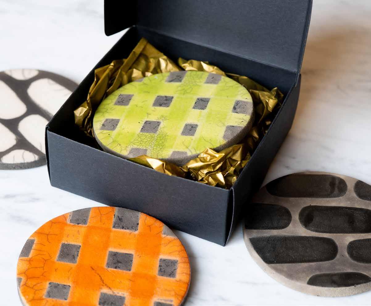 Working with fire at 1000 degrees Celsius is an intense physical process that results in unique smoked objects. Thanks to the many variables in the Raku process, every result is a surprise, even for the artist herself! No two objects will ever be the same. Kiki maintains her intuitive approach, creating a rich, sensory experience.