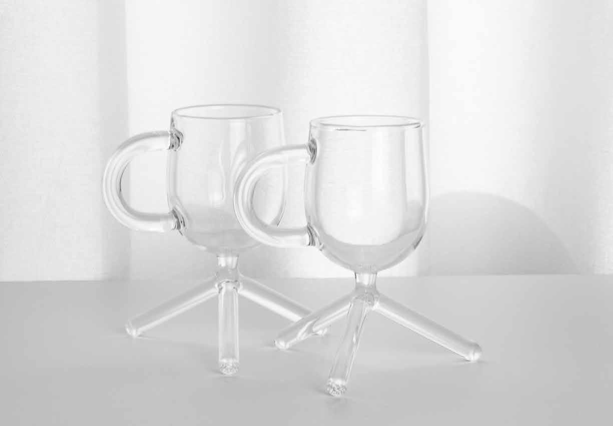 Interesting detail: the first Tripod objects were made here in Eindhoven, together with the son of a master glassblower from Philips. Our city has a rich history of glassblowing: all light bulbs and television screens used to be made of glass. The series has been a great success: after the wine and water glasses, a coffee cup followed, designed to optimally showcase your favorite coffee beans. The transparent design offers a perfect view of the different layers of espresso, making every cup a small experience.