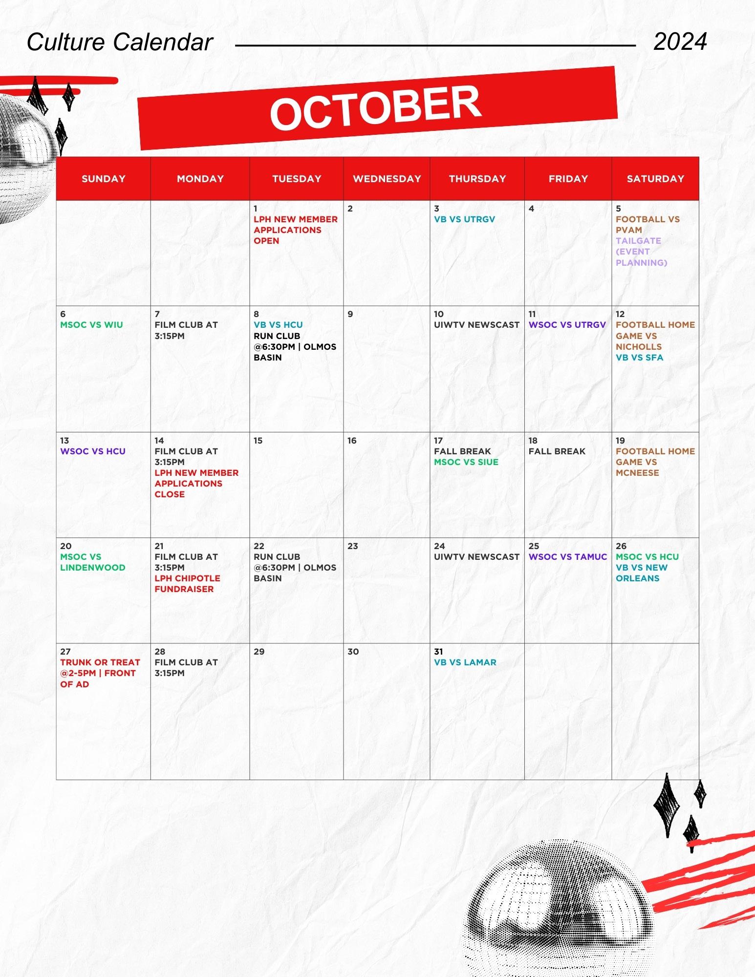 · October 2024: Men’s Football, Women’s & Men’s Soccer, Women’s Volleyball, UIW Communication Arts Fundraiser at Chipotle, Trunk or Treat