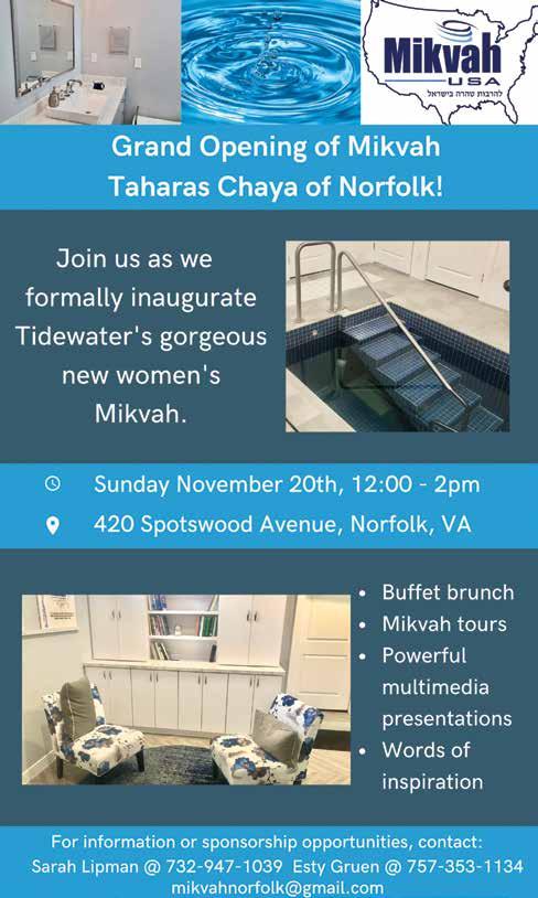 Mikvah Taharas Chaya’s formal inauguration to take place. 420 Spotswood Ave. 12–2 pm. mikvahnorfolk@gmail.com.