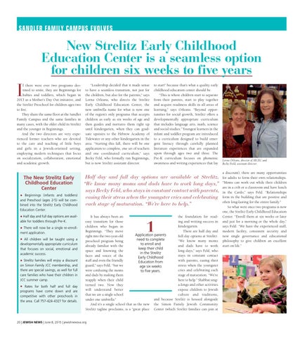 Half day and full day options are available at Strelitz. “We know many moms and dads have to work long days,” says Becky Feld, who stays in constant contact with parents, easing their stress when the youngster cries and celebrating each stage of maturation. “We’re here to help.” the foundation for readIt has always been an ing and writing success in easy transition for those kindergarten. children who began in There are half day and Beginnings. “They move Application parents full day options at Strelitz. right into the two-year-old need to complete “We know many moms preschool program being to enroll and and dads have to work already familiar with the keep their child long days,” says Feld, who space and knowing the in the Strelitz stays in constant contact faces and voices of the Early Childhood with parents, easing their staff and even the friendly Education from stress when the youngster guard,” says Feld, “but we age six weeks cries and celebrating each were confusing the moms to five years. stage of maturation. “We’re and dads by making them here to help.” Shabbat singreapply when their child a-longs and other activities turned two. Now they expose children to Jewish will understand better culture and traditions, that we are a single school and because Strelitz is housed alongside under one umbrella.” And it’s a single school that as the new the Simon Family Jewish Community Strelitz tagline proclaims, is a “great place Center (which Strelitz families can join at