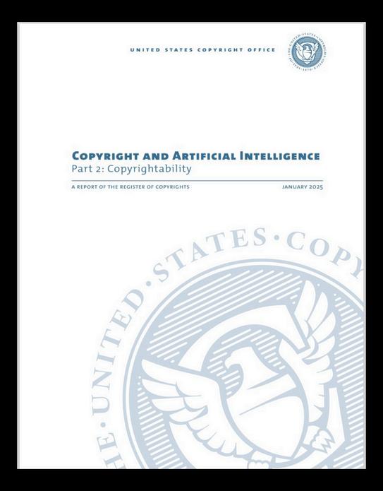 U.S. Copyright Office Policy (2023): The USCO issued guidance stating that works generated solely by AI without human creative input are not eligible for copyright.