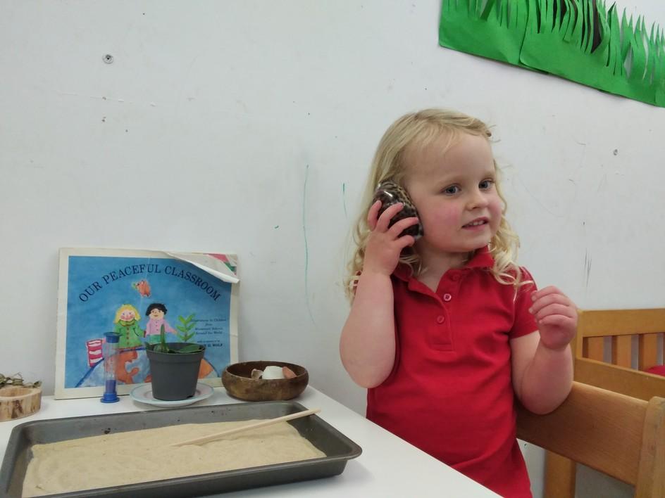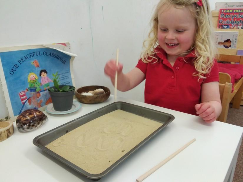 During this term in the Butterfly Room the children have been discussing 'The Colour Monster' and being calm (green). We have created a Peace Table, used for both being Zen and to discuss any misunderstanding between friends. Eliza enjoyed some Zen time, tracing in the sand, building a Zen garden and listening to the sea in the shells
