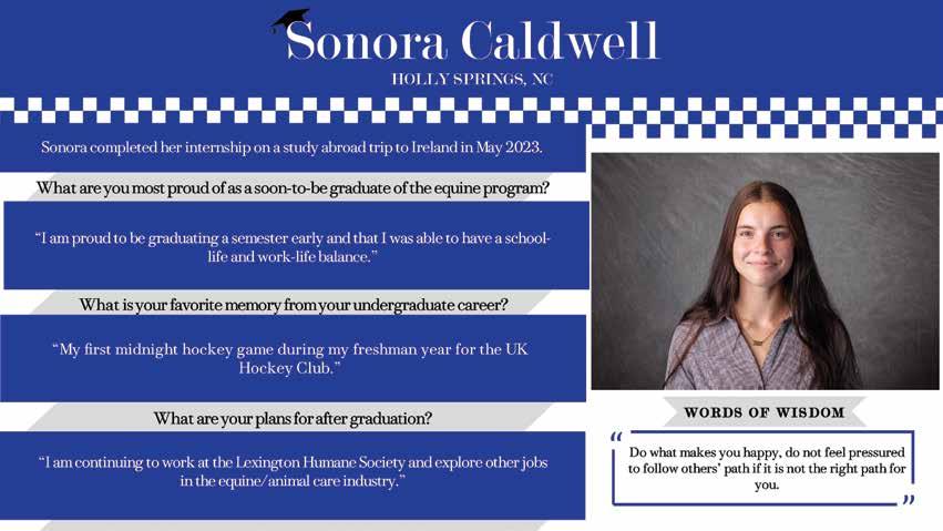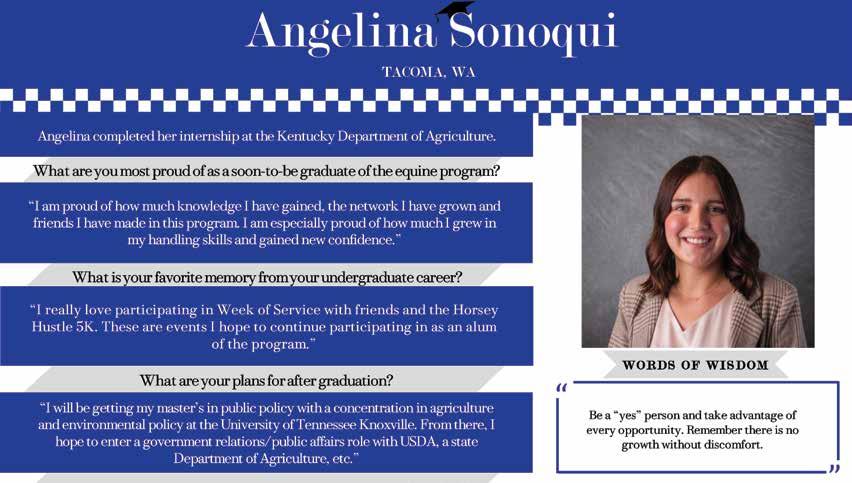 veterinarian. Like many students, her career path evolved during her time at UK, where she found a passion for policy and legislation. It was after taking AFE 100: Issues in Agriculture, Food and Environment, a course that introduced her to the broad sectors of agriculture, that she began having an interest in law and policy. With the guidance and support of her advisors and mentors, Sonoqui felt confident