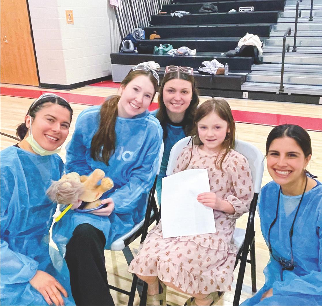 The College of Dentistry transports and sets up a ten-chair mobile dental clinic in the gym. Each station utilizes a portable suitcase compressor, which provides suction, air/water, and connections for dental handpieces. Standard infection control and clinical protocols are followed. Light-cured dental sealants are applied with proper isolation and high-volume suction. Students also receive oral hygiene education and a dental cleaning with fluoride varnish application. Radiographs are provided as needed.