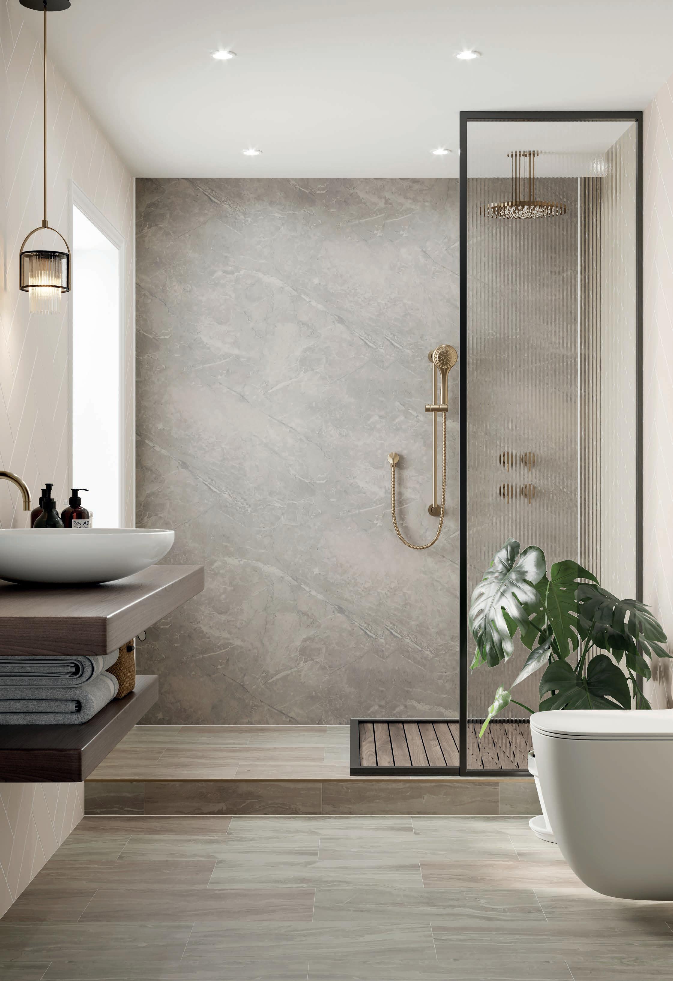 Levanto marble creates a timeless effect, displaying a range of shades from grey to a subtle blush pink. The sleek matt finish of this tile effect panel adds an elegant touch to any bathroom.