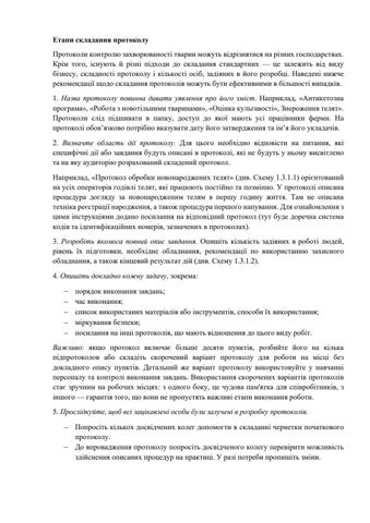 Етапи складання протоколу Протоколи контролю захворюваності тварин можуть відрізнятися на різних господарствах. Крім того, існують й різні підходи до складання стандартних — це залежить від виду бізнесу, складності протоколу і кількості осіб, задіяних в його розробці. Наведені нижче рекомендації щодо складання протоколів можуть бути ефективними в більшості випадків. 1. Назва протоколу повинна давати уявлення про його зміст. Наприклад, «Антикетозна програма», «Робота з новотільними тваринами», «Оцінка кульгавості», Знероження телят». Протоколи слід підшивати в папку, доступ до якої мають усі працівники ферми. На протоколі обов’язково потрібно вказувати дату його затвердження та ім’я його укладачів. 2. Визначте область дії протоколу. Для цього необхідно відповісти на питання, які специфічні дії або завдання будуть описані в протоколі, які не будуть у ньому висвітлено та на яку аудиторію розрахований складений протокол. Наприклад, «Протокол обробки новонароджених телят» (див. Схему 1.3.1.1) орієнтований на усіх операторів годівлі телят, які працюють постійно та позмінно. У протоколі описана процедура догляду за новонародженим телям в першу годину життя. Там не описана техніка реєстрації народження, а також процедура першого напування. Для ознайомлення з цими інструкціями додано посилання на відповідний протокол (тут буде доречна система кодів та ідентифікаційних номерів, зазначених в протоколах). 3. Розробіть якомога повний опис завдання. Опишіть кількість задіяних в роботі людей, рівень їх підготовки, необхідне обладнання, рекомендації по використанню захисного обладнання, а також кінцевий результат дій (див. Схему 1.3.1.2). 4. Опишіть докладно кожну задачу, зокрема: -