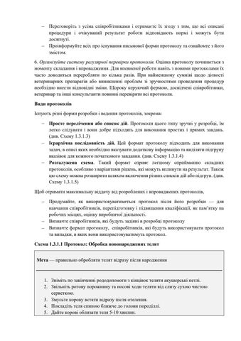 - Переговоріть з усіма співробітниками і отримаєте їх згоду з тим, що всі описані процедури і очікуваний результат роботи відповідають нормі і можуть бути досягнуті. - Проінформуйте всіх про існування письмової форми протоколу та ознайомте з його змістом. 6. Організуйте систему регулярної перевірки протоколів. Оцінка протоколу починається з моменту складання і впровадження. Для впевненої роботи навіть з новими протоколами їх часто доводиться переробляти по кілька разів. При найменшому сумніві щодо дієвості ветеринарних препаратів або виникненні проблем зі зручностями проведення процедур необхідно внести відповідні зміни. Щороку керуючий фермою, досвідчені співробітники, ветеринар та інші консультанти повинні перевіряти всі протоколи. Види протоколів Існують різні форми розробки і ведення протоколів, зокрема: - Просте перелічення або список дій. Протоколи цього типу зручні у розробці, їм легко слідувати і вони добре підходять для виконання простих і прямих завдань. (див. Схему 1.3.1.3) - Ієрархічна послідовність дій. Цей формат протоколу підходить для виконання задач, в описі яких необхідно вказувати додаткову інформацію та виділяти підгрупу вказівок для кожного початкового завдання. (див. Схему 1.3.1.4) - Розгалужена схема. Такий формат сприяє легшому сприйманню складних протоколів, особливо з варіантами рішень, які можуть вплинути на результат. Також цю схему можна розширити шляхом включення різних списків дій або підгруп. (див. Схему 1.3.1.5) Щоб отримати максимальну віддачу від розроблених і впроваджених протоколів, - Продумайте, як використовуватиметься протокол після його розробки — для навчання співробітників, перепідготовку і підвищення кваліфікації, як пам’ятку на робочих місцях, оцінку виробничої діяльності. - Визначте співробітників, які будуть задіяні в розробці протоколу - Визначте формат протоколу, співробітників, які будуть використовувати протокол та випадки, в яких вони використовуватимуть протокол. Схема 1.3.1.1 Протокол: Обробка новонароджених телят Мета — правильно обробляти телят відразу після народження