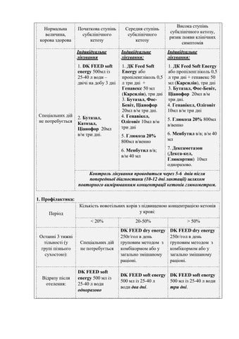 Висока ступінь субклінічного кетозу, ризик появи клінічних симптомів Індивідуальне лікування: 1. ДК Feed Soft Energy або пропіленгліколь 0,5 л три дні + гепавекс 50 мл (Карсилін), три дні 3. Бутазал, Фос-Бевіт, Ціанофор 20мл в/м три дні. 4. Гепавікел, Оліговіт 10мл в/м три дні 5. Глюкоза 20% 800мл в/венно 6. Менбутил в/в; в/м 40 мл 7. Дексаметазон (Декса-кел, Глюкортин) 10мл одноразово.