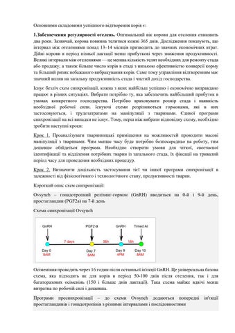 Основними складовими успішного відтворення корів є: 1.Забезпечення регулярності отелень. Оптимальний вік корови для отелення становить два роки. Зазвичай, корова повинна телитися кожні 365 днів. Дослідження показують, що інтервал між отеленнями понад 13–14 місяців призводить до значних економічних втрат. Дійні корови в період пізньої лактації менш прибуткові через зниження продуктивності. Великі інтервали між отеленнями — це менша кількість телят необхідних для ремонту стада або продажу, а також більше число корів в стаді з низькою ефективністю конверсії корму та більший ризик небажаного вибракування корів. Саме тому управління відтворенням має значний вплив на загальну продуктивність стада і чистий дохід господарства. Існує безліч схем синхронізації, кожна з яких найбільш успішно і економічно виправдано працює в різних ситуаціях. Вибрати потрібно ту, яка забезпечить найбільший прибуток в умовах конкретного господарства. Потрібно враховувати розмір стада і наявність необхідної робочої сили. Існуючі схеми розрізняються гормонами, які в них застосовуються, і трудозатратами на маніпуляції з тваринами. Єдиної програми синхронізації на всі випадки не існує. Тому, перш ніж вибрати відповідну схему, необхідно зробити наступні кроки: Крок 1. Проаналізувати тваринницькі приміщення на можливостей проводити масові маніпуляції з тваринами. Чим менше часу буде потрібно безпосередньо на роботу, тим дешевше обійдеться програма. Необхідно створити умови для чіткої, своєчасної ідентифікації та відділення потрібних тварин із загального стада, їх фіксації на тривалий період часу для проведення необхідних процедур. Крок 2. Визначити доцільність застосування тієї чи іншої програми синхронізації в залежності від фізіологічного і технологічного стану, продуктивності тварин. Короткий опис схем синхронізації: Ovsynch – гонадотропний релізинг-гормон (GnRH) вводиться на 0-й і 9-й день, простагландин (PGF2a) на 7-й день Схема синхронізації Ovsynch