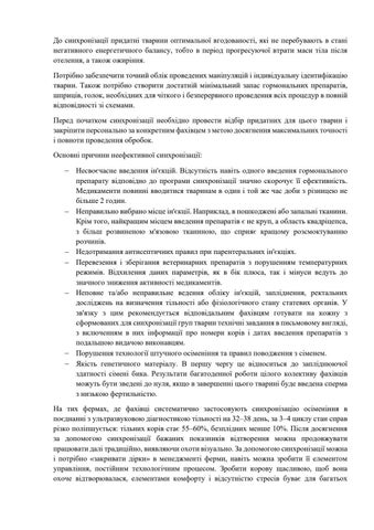 До синхронізації придатні тварини оптимальної вгодованості, які не перебувають в стані негативного енергетичного балансу, тобто в період прогресуючої втрати маси тіла після отелення, а також ожиріння. Потрібно забезпечити точний облік проведених маніпуляцій і індивідуальну ідентифікацію тварин. Також потрібно створити достатній мінімальний запас гормональних препаратів, шприців, голок, необхідних для чіткого і безперервного проведення всіх процедур в повній відповідності зі схемами. Перед початком синхронізації необхідно провести відбір придатних для цього тварин і закріпити персонально за конкретним фахівцем з метою досягнення максимальних точності і повноти проведення обробок. Основні причини неефективної синхронізації: - Несвоєчасне введення ін'єкцій. Відсутність навіть одного введення гормонального препарату відповідно до програми синхронізації значно скорочує її ефективність. Медикаменти повинні вводитися тваринам в один і той же час доби з різницею не більше 2 годин. - Неправильно вибрано місце ін'єкції. Наприклад, в пошкоджені або запальні тканини. Крім того, найкращим місцем введення препаратів є не круп, а область квадріцепса, з більш розвиненою м'язовою тканиною, що сприяє кращому розсмоктуванню розчинів. - Недотримання антисептичних правил при парентеральних ін'єкціях. - Перевезення і зберігання ветеринарних препаратів з порушенням температурних режимів. Відхилення даних параметрів, як в бік плюса, так і мінуси ведуть до значного зниження активності медикаментів. - Неповне та/або неправильне ведення обліку ін'єкцій, запліднення, ректальних досліджень на визначення тільності або фізіологічного стану статевих органів. У зв'язку з цим рекомендується відповідальним фахівцям готувати на кожну з сформованих для синхронізації груп тварин технічні завдання в письмовому вигляді, з включенням в них інформації про номери корів і датах введення препаратів з подальшою видачою виконавцям. - Порушення технології штучного осіменіння та правил поводження з сіменем. - Якість генетичного матеріалу. В першу чергу це відноситься до запліднюючої здатності сімені бика. Результати багатоденної роботи цілого колективу фахівців можуть бути зведені до нуля, якщо в завершенні цього тварині буде введена сперма з низькою фертильністю. На тих фермах, де фахівці систематично застосовують синхронізацію осіменіння в поєднанні з ультразвуковою діагностикою тільності на 32–38 день, за 3–4 циклу стан справ різко поліпшується: тільних корів стає 55–60%, безплідних менше 10%. Після досягнення за допомогою синхронізації бажаних показників відтворення можна продовжувати працювати далі традиційно, виявляючи охоти візуально. За допомогою синхронізації можна і потрібно «закривати дірки» в менеджменті ферми, навіть можна зробити її елементом управління, постійним технологічним процесом. Зробити корову щасливою, щоб вона охоче відтворювалася, елементами комфорту і відсутністю стресів буває для багатьох