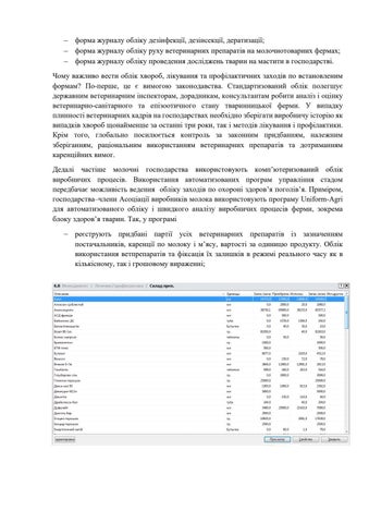 - форма журналу обліку дезінфекції, дезінсекції, дератизації; - форма журналу обліку руху ветеринарних препаратів на молочнотоварних фермах; - форма журналу обліку проведення досліджень тварин на мастити в господарстві. Чому важливо вести облік хвороб, лікування та профілактичних заходів по встановленим формам? По-перше, це є вимогою законодавства. Стандартизований облік полегшує державним ветеринарним інспекторам, дорадникам, консультантам робити аналіз і оцінку ветеринарно-санітарного та епізоотичного стану тваринницької ферми. У випадку плинності ветеринарних кадрів на господарствах необхідно зберігати виробничу історію як випадків хвороб щонайменше за останні три роки, так і методів лікування і профілактики. Крім того, глобально посилюється контроль за законним придбанням, належним зберіганням, раціональним використанням ветеринарних препаратів та дотриманням каренційних вимог. Дедалі частіше молочні господарства використовують комп’ютеризований облік виробничих процесів. Використання автоматизованих програм управління стадом передбачає можливість ведення обліку заходів по охороні здоров’я поголів’я. Приміром, господарства–члени Асоціації виробників молока використовують програму Uniform-Agri для автоматизованого обліку і швидкого аналізу виробничих процесів ферми, зокрема блоку здоров’я тварин. Так, у програмі - реєструють придбані партії усіх ветеринарних препаратів із зазначенням постачальників, каренції по молоку і м’ясу, вартості за одиницю продукту. Облік використання ветпрепаратів та фіксація їх залишків в режимі реального часу як в кількісному, так і грошовому вираженні;