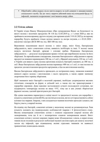 2.2 Гігієна доїння В Україні згідно Наказу Мінагрополітики «Про затвердження Вимог до безпечності та якості молока і молочних продуктів» № 118 від 12.03.2019 р., з 1 січня 2020 р. вже не приймають молокосировину другого ґатунку для харчових цілей. З 01.01.2023 р. на харчову переробку будуть приймати тільки молоко вищого та екстра ґатунків, а з 01.01.2024 – виключно «екстра» (КСК 400 тис./мл, ЗБО 100 тис./мл). Важливими показниками якості молока є: вміст жиру, вміст білка, бактеріальна забрудненість, вміст соматичних клітин, наявність інгібіторів та інші. У молоці також можуть міститися бактерії, дріжджі і плісняві грибки. Підвищена бактеріальна забрудненість — результат недотримання правил гігієни при виробництві молока чи його зберіганні. За європейськими стандартами, показник бактеріального забруднення в сирому продукті не повинен перевищувати 100 тис. в 1 см3, у Франції допускають 120 тис. в 1 см3, в Україні для вищого сорту молока орієнтовна кількість бактерій становить до 300 тис. в см3. Якщо бактеріальне забруднення молока перевищує 400 тис. в 1 см3, то таке молоко не придатне для виготовлення продуктів харчування, а йде на виготовлення казеїну. Висока бактеріальна забрудненість призводить до погіршення смаку, зниження поживної цінності сирого молока і виготовлених з нього продуктів, а також сприяє значному скороченню його терміну зберігання. Щоб зменшити вміст бактерій в молочній сировині, необхідно дотримуватися високих гігієнічних стандартів на фермі, в доїльній залі, а також під час транспортування і переробки сировини. Дуже важливо застосовувати сучасні охолоджуючі установки, що підтримують температуру молока не вище +4°С, тому що в цих умовах зберігається фермент молока, здатний пригнічувати ріст бактерій. Ще одним важливим параметром в оцінці якості та придатності молока для переробки є кількість соматичних клітин (КСК), що містяться в молоці, які по суті представляють собою клітини тіла тварини. Зокрема, з них складаються тканини молочних проходів і альвеол, які беруть участь у секреції молока. На відміну від бактерій, соматичні клітини у видоєному молоці не розмножуються. Їхня кількість залежить від індивідуальних особливостей тварини і її фізіологічного стану. Висока концентрація соматичних клітин є ознакою порушення секреції молока або захворювання, хоча ще й не є незаперечною ознакою захворювання вимені. Вміст соматичних клітин у молоці здорових тварин може збільшуватися з віком, в перші кілька тижнів після отелення в результаті мобілізації імунної системи корів для захисту молочної залози від інфекцій, при підвищеному впливі стресових чинників чи наявності травматичних пошкоджень вимені.
