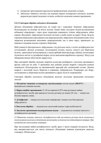5. контролює проходження персоналом профілактичних медичних оглядів; 6. забезпечує наявність аптечки для надання першої долікарської допомоги, ведення журналів реєстрації медичних оглядів, особистих медичних книжок працівників. 2.2.3 Санітарна обробка доїльного обладнання Доїльне обладнання забруднюється, як ззовні так і зсередини. Зовнішнє забруднення безпосередньо не впливає на якість молока. Однак може слугувати місцем розмноження небажаної мікрофлори і через руки операторів машинного доїння забруднювати дійки корови. Внутрішнє забруднення молочної системи в своїй основі це жири і білки. Будучи хорошим живильним середовищем для мікроорганізмів, забруднене обладнання може стати джерелом розмноження шкідливих мікроорганізмів, що в свою чергу, призводить до швидкого псування молока в процесі зберігання. Щоб уникнути бактеріального забруднення, слід ретельно мити, а потім дезінфікувати все устаткування. Доїльні установки, охолоджувачі молока, насоси, ємності для зберігання молока, транспортні молокопроводи, а також дрібний інвентар (відра, дійниці, молокоміри) підлягають миттю та дезінфекції відразу після закінчення виробничого процесу. Посуд для обмивання вимені обов’язково маркується. При санітарній обробці доїльних апаратів колектори розбирають і ретельно промивають вручну один раз на добу. У проміжках між доїнням доїльні апарати і вакуумні шланги підвішують безпосередньо на промивальний пристрій або спеціальний стелаж. Доїльні апарати і молочний посуд зберігати в корівнику забороняється. Резервуари для збору, охолодження та зберігання молока промивають одразу після їх спорожнення. Санітарна обробка молочного обладнання включає послідове проведення наступних заходів: 1. Механічне чищення та попереднє ополіскування теплою водою (30±5°С) — видаляються залишки молока 2. Циркуляційне промивання 15–20 хв гарячим 0,25%-ним розчином мийнодезінфікуючого засобу при швидкості потоку розчину не менше 20 л/хв — знімається білково-жирова плівка 3. Дезінфекція — знищується патогенні мікрофлора і знижується бактеріальна забрудненість 4. Кислотна обробка — видаляється «молочний камінь» (при необхідності) 5. Заключне промивання водопровідною водою — видаляються залишки миючого і дезінфікуючого розчинів (!) Наявність залишку миючого, дезінфікуючого або кислотного розчину після заключного ополіскування молочного обладнання визначають за допомогою індикаторних папірців. При необхідності ополіскують повторно. При застосуванні мийно-дезінфікуючого засобу другу і третю операції поєднують. Вода, яка використовується для миття доїльного обладнання повинна відповідати вимогам стандарту «Питна вода».