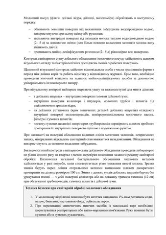 Молочний посуд (фляги, доїльні відра, дійниці, молокоміри) обробляють в наступному порядку: - обмивають зовнішні поверхні від механічних забруднень водопровідною водою, використовуючи при цьому щітку або рушники; - звільняють внутрішні поверхні від залишків молока теплою водопровідною водою (2– 5 л) за допомогою щітки (для більш повного видалення залишків молока воду змінюють двічі); - промивають мийно-дезінфікуючим розчином (2– 5 л) рівномірно всю поверхню. Контроль санітарного стану доїльного обладнання і молочного посуду здійснюють шляхом візуального огляду та бактеріологічних досліджень змивів з робочих поверхонь. Щоденний візуальний контроль здійснює відповідальна особа з числа працівників ферми в період між доїння корів та робить відмітку у відповідному журналі. Крім того, необхідно проводити хімічний контроль на залишок мийно-дезінфікуючих засобів за допомогою універсального індикаторного паперу. При візуальному контролі найперше звертають увагу на важкодоступні для миття ділянки: - в доїльних апаратах – внутрішня поверхня головки дійкової гуми; - внутрішня поверхня колектора і штуцерів, молочних трубок і шлангів під ущільнювачем кришки відра; - на доїльних установках (крім зазначених деталей доїльних апаратів) оглядають внутрішні поверхні молокопроводів, повітророзподілювача молочного насоса, фільтра і гумових шлангів; - чистоту гумових шлангів і непрозорих трубопроводів перевіряють шляхом пробного протирання їх внутрішніх поверхонь щіткою з подовженою ручкою. При наявності на поверхні обладнання видимих слідів молочних залишків, неприємного запаху, мінеральних відкладень санітарний стан вважається незадовільним. Обладнання не використовують до повного видалення забруднень. Бактеріологічний контроль санітарного стану доїльного обладнання проводять лабораторно не рідше одного разу на квартал з метою перевірки виконання заданого режиму санітарної обробки. Визначення загальної бактеріального обсіменіння чашковим методом здійснюється у разі потреби, коли спостерігається різке зниження якості молока. Зразки змивів беруть перед доїння стерильними ватними тампонами шляхом двократного протирання на ділянці розміром 100 см. Змиви з деяких вузлів доїльних апаратів беруть без урахування площі — з усієї поверхні колектора або на довжину тримача тампона (12 см) при обстеженні трубопроводів, гумових шлангів і дійкової гуми. Техніка безпеки при санітарній обробці молочного обладнання 1. У молочному відділенні повинна бути аптечка наповнена 1%-ним розчином соди, ватою, бинтами, настоянкою йоду, лейкопластиром. 2. При переливанні синтетичних миючих засобів із заводської тари необхідно користуватися респіраторами або ватно-марлевими пов'язками. Руки повинні бути сухими або в гумових рукавичках.