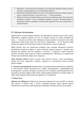2.3 Доїльне обладнання Прибутковість молочної ферми залежить від ефективності доїльної зали. В свою чергу, ефективність напряму залежить від того, як корови заходять на доїння. Бажаний час входу — 1 секунда на доїльне місце. Тривалість доїння залежить від кількості доїнь. При дворазовому доїнні групу корів слід доїти 60 хв., триразовому — 45 хв. Загалом доїння корови має займати не більше трьох годин на добу, разом із часом на переходи. Вибір доїльної зали має визначатися розміром стада, планами збільшення поголів’я, економічним впливом на ферму, а також здатністю навчати персонал і керувати ним. Кожний тип доїльної зали має переваги та недоліки. У «паралелі» можна збільшити кількість доїльних місць, якщо ви плануєте розширюватись. Водночас тут витрачається більше часу на навчання доярів, ніж у «каруселі». Типи доїльних систем. Існують основні типи доїльних систем, а саме молокопровід, доїльні зали типу «паралель», «ялинка», «карусель» та автоматичні доїльні системи (роботи-дояри). 1. Систему молокопроводів використовують для доїння корів на прив’язному утриманні. У такій системі молоко висмоктується в трубку (молокопровід) і перенаправляється безпосередньо у молочну цистерну за допомогою того ж вакууму, який використовується при роботі доїльних апаратів. При такому доїнні оператор приносить доїльний апарат до корів. Один оператор може одночасно управляти 6–12 апаратами. 2. Доїльні зали. Доїльна зала «Паралель». Корів доять групами, розміщуючи їх під кутом 90° до доїльної ями. Доступ до вимені ззаду. У залах зі швидким виходом грудні бар’єри можуть підніматися та опускатися, щоб корови мали можливість швидкого виходу після доїння.