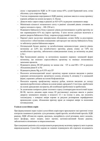 силос з перетравністю НДК за 30 годин понад 65%, сухий буряковий жом, соєва оболонка, суха спиртова барда З метою покращення перетравності НДК раціону доцільно ввести в склад преміксу кормові добавки на основі екстракту A. Oryzae Довести вміст сирого жиру в раціоні до 4,0–4,5% за рахунок захищеного жиру Мінімізація кількості незасвоєного азоту в раціоні: цільовий рівень сечовини на період теплового стресу – 180–230 мг/л Підвищити байпасність білку в раціоні: рівень розчеплюваного в рубці протеїну не має перевищувати 61% від сирого протеїну. З цією метою доцільно включати в раціон джерела байпасного білку, зокрема кукурудзяний глютен. Окремої уваги заслуговує використання обсмажених соєвих бобів за роустерною технологією з обов’язковим плющенням: цей продукт має високу байпасність білку та забезпечує раціон байпасним жиром. Оптимальний баланс раціону за метаболічними амінокислотами: довести рівень метионіну до 2,6% від метаболічного протеїну, рівень лізину до 7,0% від метаболічного протеїну, забезпечити співвідношення лізину до метионіну на рівні 2,70:1 При балансуванні раціону за метионіном надавати перевагу захищеній формі метионіну, що посилює стресостійкість організму та зменшує інтенсивність запальних процесів. Підвищити рівень DCAD раціону не менше ніж +25 м.-екв/100 г СР за рахунок збільшення рівня К та Na Підвищити рівень Mg до 0.35% від СР Посилити антиоксидантний захист організму корови шляхом введення в раціон кормових антиоксидантів: органічного селену, вітаміну Е, вітаміну С в захищеній формі, кормових добавок на основі біофлавоноїдів Посилити кормову профілактику ацидозу рубця, шляхом введення до складу преміксів пробіотичних добавок на основі живих дріжджів S. Cerevisiae, пребіотиків на основі дріжджових екстрактів, або комбінації пробіотиків та пребіотиків. За досягнення помірного рівня теплового стресу (температурно-вологістний індекс 80–90, частота дихання корів понад 85 раз/хвилину) доцільно ввести в раціон джерело захищеного ніацину в кількості 12 г на голову в день, що посилить тепловіддачу з поверхні шкіри корови за рахунок розширення периферичних кровоносних судин, збільшення притоку крові до поверхні шкіри та посилення потовиділення.