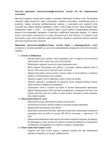 Загальні принципи лікувально-профілактичних заходів під час вирощування молодняку Протягом першого місяця життя діарея є основною причиною загибелі телят. Економічне значення діареї величезне через, відповідно, загибель молодняку, погіршення росту й розвитку, перше отелення відбуватиметься пізніше, а загальний стан здоров’я після отелення цих тварин гірший, порівняно з тими, у яких діареї не було. Інші витрати через виникнення діареї у телят — це витрати праці, оплата роботи ветеринарних фахівців, витрати на ветеринарні препарати. Смертність найбільша упродовж перших 2-х тижнів життя, потім різко зменшується та знову збільшується у віці близько 2-х місяців, після відлучення, адже після випадків діареї вірогідність розвитку запалення органів дихання збільшується більш ніж у 20 разів. Принципи лікувально-профілактичних заходів діареї у новонароджених телят полягають у загально відомій тезі, що легше захворювання попередити, ніж потім лікувати тварину: 1) Гігієна та біобезпека - Контролювати рух людей в зоні утримання телят та навколо неї, дозволяти знаходження там тільки тим, кому це необхідно - Відвідувачів тримати подалі від зони утримання телят - Мати окреме обладнання для роботи з телятами, завжди тримати його в чистоті. Це стосується й чистоти одягу та взуття - Завжди мити руки теплою водою з милом перед та після роботи з телятами, кормом та обладнанням для годуванн - Тримати хворих телят в окремому загоні, подалі від інших - Тримати протокол дезінфекції на видному місці, використовувати якісні, зареєстровані дезінфікуючі препарати - Утримувати телят в стороні від корів та шляхів пересування транспорту ферми. Корови можуть бути носіями захворювань, та важливо пам’ятати, що імунна система телят ще слабка та вони можуть захворіти значно швидше, ніж старші тварини 2) Посилення імунітету телят - Мінімізувати стрес-фактори бідь якого походження - Оптимальні кількості якісних кормів та належні умови утримання - Правильний менеджмент молозивом - Додаткове підсилення місцевих захисних механізмів у кишечнику за рахунок додавання двічі на добу до молока 150–250 мл молозива — протягом 7–10 днів - Проведення вакцинації корів проти шкідливої кишкової палички, ротавірусу й коронавірусу може допомогти тримати відповідні інфекції під контролем, зменшивши захворюваність та тяжкість перебігу захворювань 3) Раннє виявлення хворих телят. - Здорове теля буде стояти прямо, з прямою спиною або при наближенні швидко вставатиме, та матиме добрий апетит