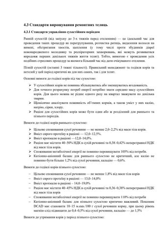4.3 Стандарти вирощування ремонтних телиць 4.3.1 Стандарти управління сухостійним періодом Ранній сухостій (від запуску до 3-х тижнів перед отеленням) — це ідеальний час для проведення таких процедур як перегрупування, розчистка ратиць, видалення волосся на вимені, обстригання хвостів, щеплення (у тому числі проти збудників діареї новонародженого молодняку та респіраторних захворювань, які можуть розвиватися впродовж перших декількох тижнів життя телят). Тобто, вимогою є проведення усіх подібних стресових процедур за якомога більший час від дати очікуваного отелення. Пізній сухостій (останні 3 тижні тільності). Правильний менеджмент та годівля корів та нетелей у цей період критичні як для них самих, так і для телят. Основні вимоги до годівлі корів під час сухостою: Ø У сухостійних корів не повинна збільшуватись або зменшуватись вгодованість. Ø Для точного розрахунку потреб енергії потрібно знати середню масу сухостійних корів. Для цього можна не рідше одного разу на квартал зважувати по декілька тварин. Ø Щомісячно аналізувати поживність об’ємних кормів, а також уміст у них калію, натрію, сірки, хлору. Ø Раціон для сухостійних корів може бути один або ж розділений для раннього та пізнього періодів. Вимоги до годівлі корів раннього сухостою: Ø Ø Ø Ø