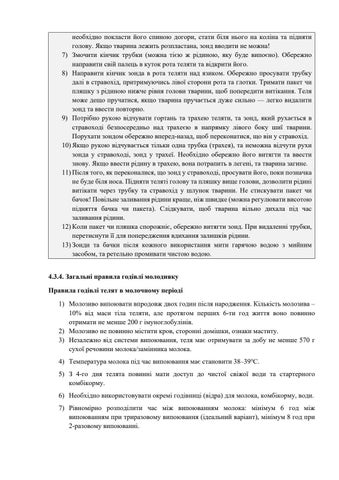 необхідно покласти його спиною догори, стати біля нього на коліна та підняти голову. Якщо тварина лежить розпластана, зонд вводити не можна! 7) Змочити кінчик трубки (можна тією ж рідиною, яку буде випоєно). Обережно направити свій палець в куток рота теляти та відкрити його. 8) Направити кінчик зонда в рота теляти над язиком. Обережно просувати трубку далі в стравохід, притримуючись лівої сторони рота та глотки. Тримати пакет чи пляшку з рідиною нижче рівня голови тварини, щоб попередити витікання. Теля може дещо пручатися, якщо тварина пручається дуже сильно — легко видалити зонд та ввести повторно. 9) Потрібно рукою відчувати гортань та трахею теляти, та зонд, який рухається в стравоході безпосередньо над трахеєю в напрямку лівого боку шиї тварини. Порухати зондом обережно вперед-назад, щоб переконатися, що він у стравохід. 10) Якщо рукою відчувається тільки одна трубка (трахея), та неможна відчути рухи зонда у стравоході, зонд у трахеї. Необхідно обережно його витягти та ввести знову. Якщо ввести рідину в трахею, вона потрапить в легені, та тварина загине. 11) Після того, як переконалися, що зонд у стравоході, просувати його, поки позначка не буде біля носа. Підняти теляті голову та пляшку вище голови, дозволити рідині витікати через трубку та стравохід у шлунок тварини. Не стискувати пакет чи бачок! Повільне заливання рідини краще, ніж швидке (можна регулювати висотою підняття бачка чи пакета). Слідкувати, щоб тварина вільно дихала під час заливання рідини. 12) Коли пакет чи пляшка спорожніє, обережно витягти зонд. При видаленні трубки, перетиснути її для попередження вдихання залишків рідини. 13) Зонди та бачки після кожного використання мити гарячою водою з мийним засобом, та ретельно промивати чистою водою. 4.3.4. Загальні правила годівлі молодняку Правила годівлі телят в молочному періоді 1) Молозиво випоювати впродовж двох годин після народження. Кількість молозива – 10% від маси тіла теляти, але протягом перших 6-ти год життя воно повинно отримати не менше 200 г імуноглобулінів. 2) Молозиво не повинно містити кров, сторонні домішки, ознаки маститу. 3) Незалежно від системи випоювання, теля має отримувати за добу не менше 570 г сухої речовини молока/замінника молока. 4) Температура молока під час випоювання має становити 38–39℃. 5) З 4-го дня телята повинні мати доступ до чистої свіжої води та стартерного комбікорму. 6) Необхідно використовувати окремі годівниці (відра) для молока, комбікорму, води. 7) Рівномірно розподілити час між випоюванням молока: мінімум 6 год між випоюванням при триразовому випоювання (ідеальний варіант), мінімум 8 год при 2-разовому випоюванні.