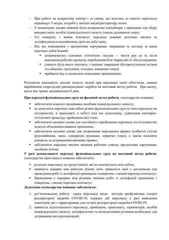 забезпечити кожного працівника засобами індивідуального захисту; не допускати перетину між собою різних функціональних груп та змін персоналу на потужностях, в транспорті, в побуті (під час відпочинку, здійснення санітарногігієнічних процедур, приймання їжі) тощо; § забезпечити належні умови для постійного перебування персоналу на потужностях шляхом обладнання наявних приміщень; § забезпечити належні умови для дотримання персоналом правил особистої гігієни (рукомийники, мило, одноразові рушники, серветки тощо), а також посилити контроль за дотриманням вказаних правил; § забезпечити персонал чистим змінним робочим одягом, продуктами харчування, засобами гігієни. У разі неможливості переходу функціональних груп на вахтовий метод роботи, господарство крім іншого повинно забезпечити: § §