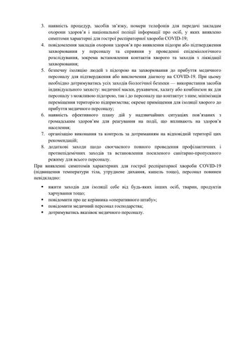 3. наявність процедур, засобів зв’язку, номери телефонів для передачі закладам охорони здоров’я і національної поліції інформації про осіб, у яких виявлено симптоми характерні для гострої респіраторної хвороби COVID-19; 4. повідомлення закладів охорони здоров’я про виявлення підозри або підтвердження захворювання у персоналу та сприяння у проведенні епідеміологічного розслідування, зокрема встановлення контактів хворого та заходів з ліквідації захворювання; 5. безпечну ізоляцію людей з підозрою на захворювання до прибуття медичного персоналу для підтвердження або виключення діагнозу на COVID-19. При цьому необхідно дотримуватись усіх заходів біологічної безпеки — використання засобів індивідуального захисту: медичної маски, рукавичок, халату або комбінезон як для персоналу з можливою підозрою, так і до персоналу що контактує з ним; мінімізація переміщення територією підприємства; окреме приміщення для ізоляції хворого до прибуття медичного персоналу; 6. наявність ефективного плану дій у надзвичайних ситуаціях пов’язаних з громадським здоров’ям для реагування на події, що впливають на здоров’я населення; 7. організацію виконання та контроль за дотриманням на відповідній території цих рекомендацій; 8. додаткові заходи щодо своєчасного повного проведення профілактичних і протиепідемічних заходів та встановлення посиленого санітарно-пропускного режиму для всього персоналу. При виявленні симптомів характерних для гострої респіраторної хвороби COVID-19 (підвищення температури тіла, утруднене дихання, кашель тощо), персонал повинен невідкладно: § § § §