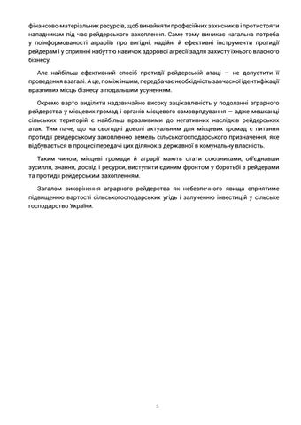 фінансово-матеріальних ресурсів, щоб винайняти професійних захисників і протистояти нападникам під час рейдерського захоплення. Саме тому виникає нагальна потреба у поінформованості аграріїв про вигідні, надійні й ефективні інструменти протидії рейдерам і у сприянні набуттю навичок здорової агресії задля захисту їхнього власного бізнесу. Але найбільш ефективний спосіб протидії рейдерській атаці — не допустити її проведення взагалі. А це, поміж іншим, передбачає необхідність завчасної ідентифікації вразливих місць бізнесу з подальшим усуненням. Окремо варто виділити надзвичайно високу зацікавленість у подоланні аграрного рейдерства у місцевих громад і органів місцевого самоврядування — адже мешканці сільських територій є найбільш вразливими до негативних наслідків рейдерських атак. Тим паче, що на сьогодні доволі актуальним для місцевих громад є питання протидії рейдерському захопленню земель сільськогосподарського призначення, яке відбувається в процесі передачі цих ділянок з державної в комунальну власність. Таким чином, місцеві громади й аграрії мають стати союзниками, об’єднавши зусилля, знання, досвід і ресурси, виступити єдиним фронтом у боротьбі з рейдерами та протидії рейдерським захопленням. Загалом викорінення аграрного рейдерства як небезпечного явища сприятиме підвищенню вартості сільськогосподарських угідь і залученню інвестицій у сільське господарство України.