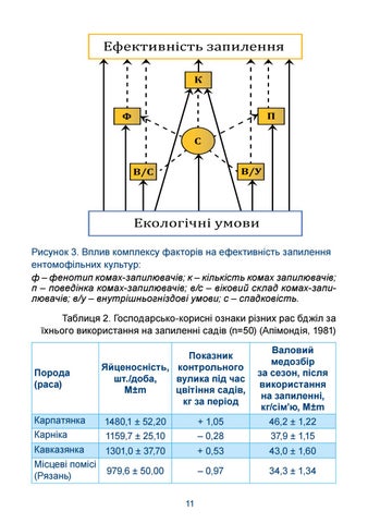 Рисунок 3. Вплив комплексу факторів на ефективність запилення ентомофільних культур: ф – фенотип комах-запилювачів; к – кількість комах запилювачів; п – поведінка комах-запилювачів; в/с – віковий склад комах-запилювачів; в/у – внутрішньогніздові умови; с – спадковість. Таблиця 2. Господарсько-корисні ознаки різних рас бджіл за їхнього використання на запиленні садів (n=50) (Апімондія, 1981)