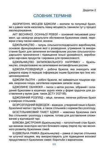 СЛОВНИК ТЕРМІНІВ АБОРИГЕННІ, МІСЦЕВІ БДЖОЛИ – екотипи та популяції бджіл, які з давніх часів населяють певну місцевість і виникли тут у процесі еволюціонування. АКТ ВЕСНЯНОЇ, ОСІННЬОЇ РЕВІЗІЇ – основний письмовий документ, що засвідчує результати обстеження бджолиних сімей, перевірки стану пасіки навесні, восени. БДЖІЛЬНИЦТВО – галузь сільськогосподарського виробництва, основою функціонування якої є розведення, утримання та використання бджіл для запилення ентомофільних рослин сільськогосподарського призначення і підвищення їхньої урожайності, виробництво харчових продуктів і сировини для промисловості. БДЖІЛЬНИЦТВО ЗАПИЛЮВАЛЬНОГО НАПРЯМКУ – бджільництво, спеціалізоване на запилюванні ентомофільних рослин. БДЖОЛА-РОЗВІДНИЦЯ – робоча бджола, яка знаходить нові джерела корму й передає інформацію іншим бджолам про їхнє місцезнаходження БДЖОЛИ ЛЬОТНІ – робочі бджоли, які займаються пошуком кормів, охороною гнізда, заготівлею кормових запасів і води. БДЖОЛИНЕ ОБНІЖЖЯ – пилок з квіток рослин, зібраний і складений бджолами в кошичках задніх ніжок у формі грудочок для доставлення у вулик (див. також ДСТУ 3127-95). БДЖОЛИНИЙ РОЗПЛІД – яйця, личинки, лялечки робочих бджіл у комірках стільників. БЕЗРОЗПЛІДНИЙ ВІДВОДОК – відводок, утворений лише із бджіл, бджолиної матки і трутнів, а також стільників з кормом без розплоду. БЕЗСТІЛЬНИКОВИЙ ПАКЕТ БДЖІЛ – невелика бджолина сім’я без стільників і розплоду з кормом, готова для доставлення споживачеві у відповідній тарі. БІЛКОВА ДИСТРОФІЯ (бджільництво) – патологічний стан бджіл, що виникає внаслідок нестачі білкового корму (перги) під час весняного розвитку бджолиних сімей. БУДІВЕЛЬНА РАМКА (бджільництво) – рамка зі смугою стільника чи штучної вощини, яку використовують для підвищення воскової продуктивності бджолиних сімей і боротьби з вароатозом. 111